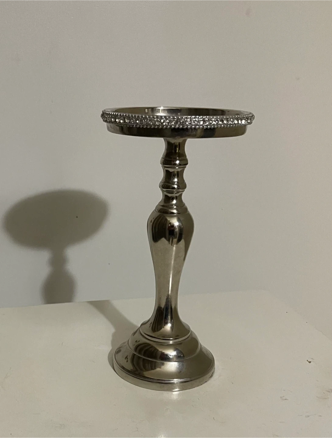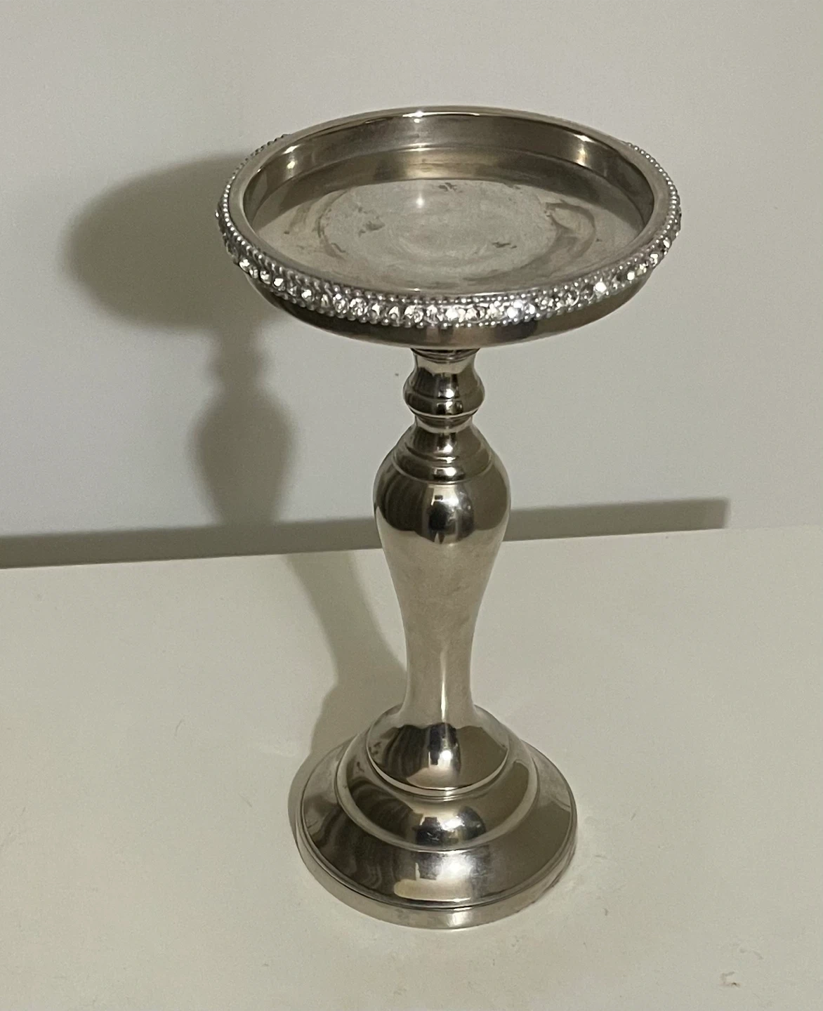A shiny silver candlestick holder with a decorative rim of rhinestones. It's designed with a classic pedestal base for stability. This holder would look lovely on a mantle or side table in any room in the house. Excellent condition, like new . From smoke-free, pest-free, and pet-free home.