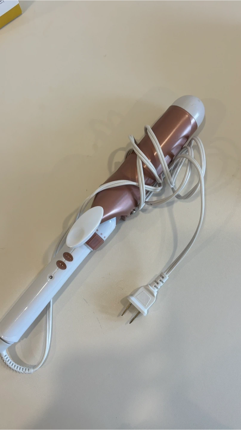 This is a rose gold curling wand. It has adjustable temperature settings for different hair types. It's great for creating beautiful curls and waves!