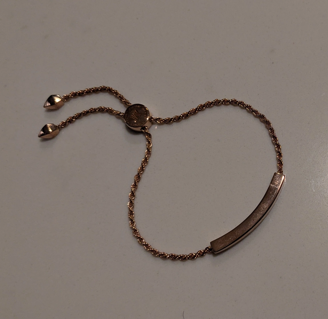 Rose gold vermeil bracelet - worn one time. Features a sleek, curved bar and twisted rope chain. Adjustable up to 23.5cm. Fastens with a toggle slider.
