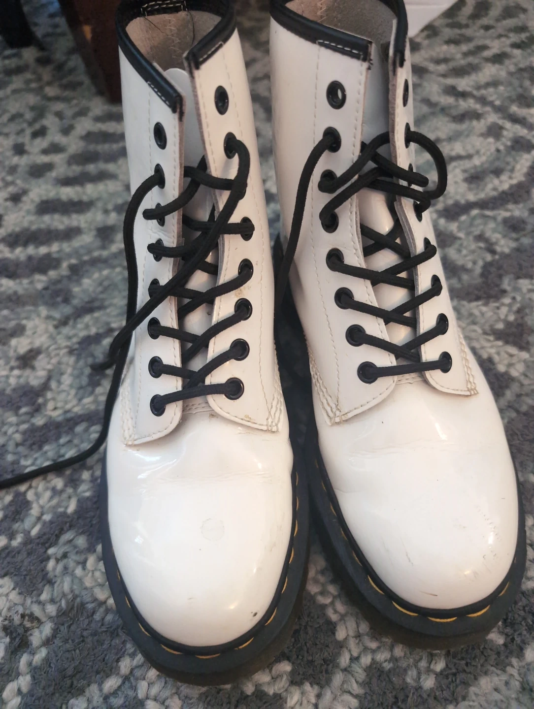 Classic Dr. Martens platform boots in a glossy white patent leather finish.