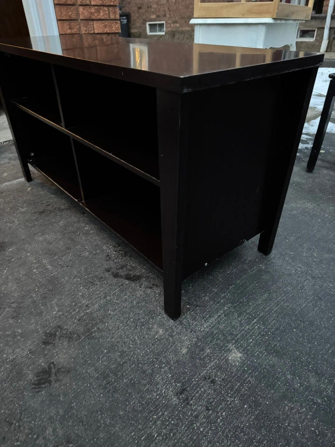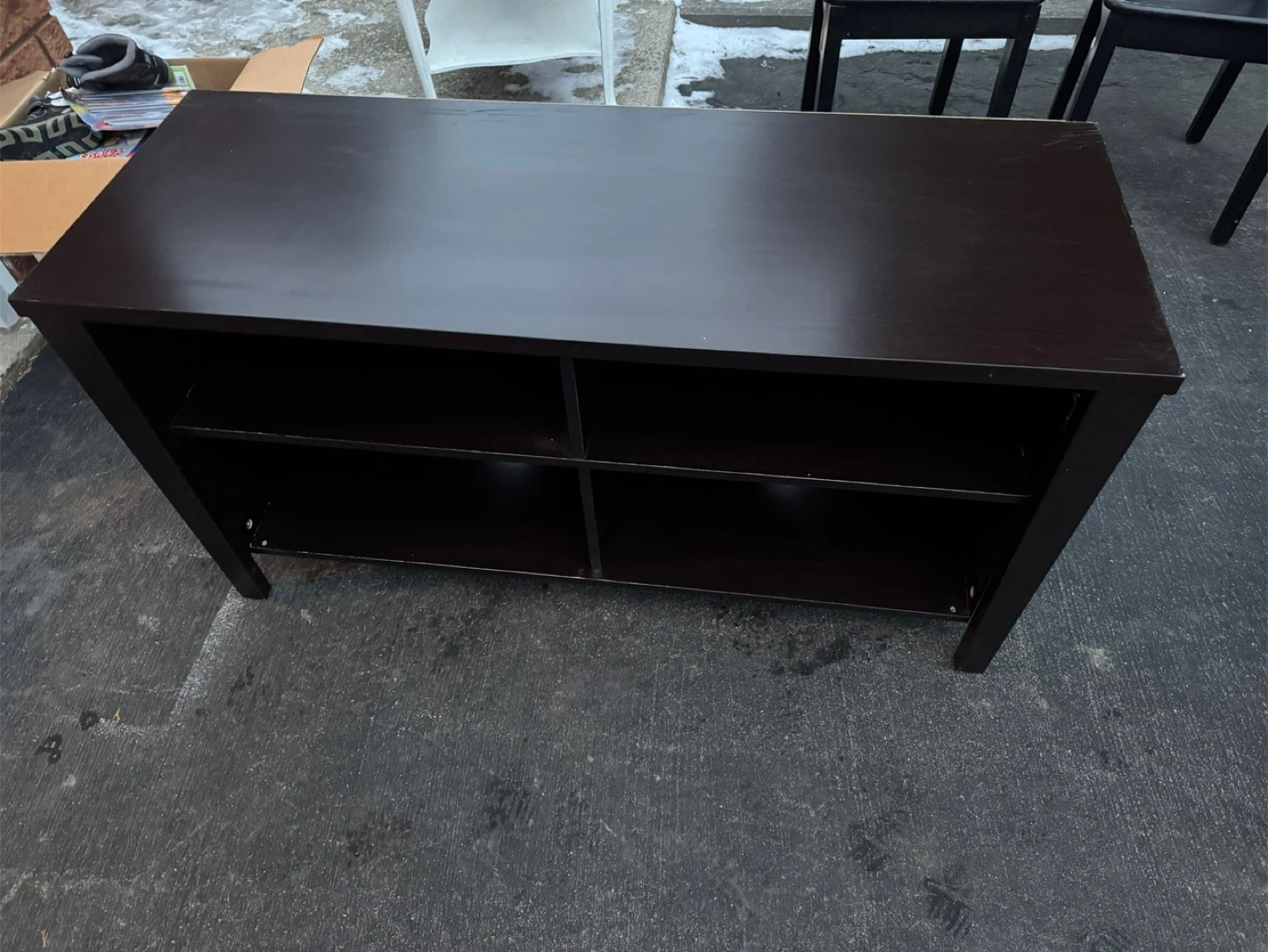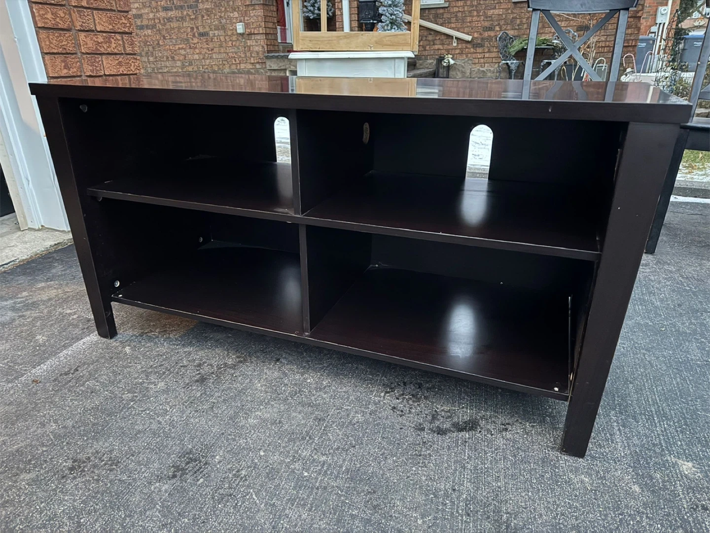 I'm selling a dark brown TV stand with shelving. It's in good condition and ready to hold your TV and media components.