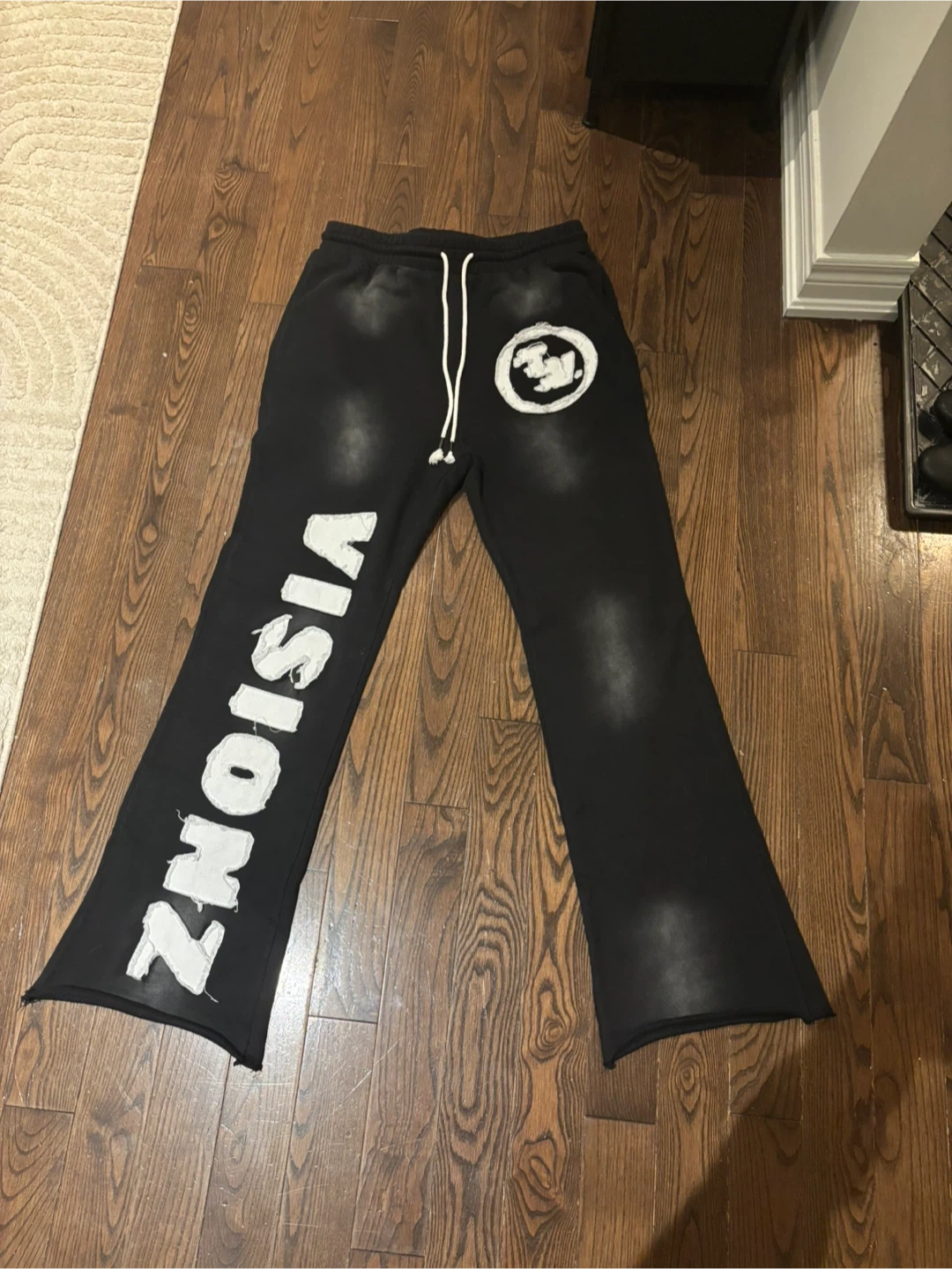 Black sweatpants with "VISIONZ" graphic on the leg. Size medium. Made of soft material for comfort.