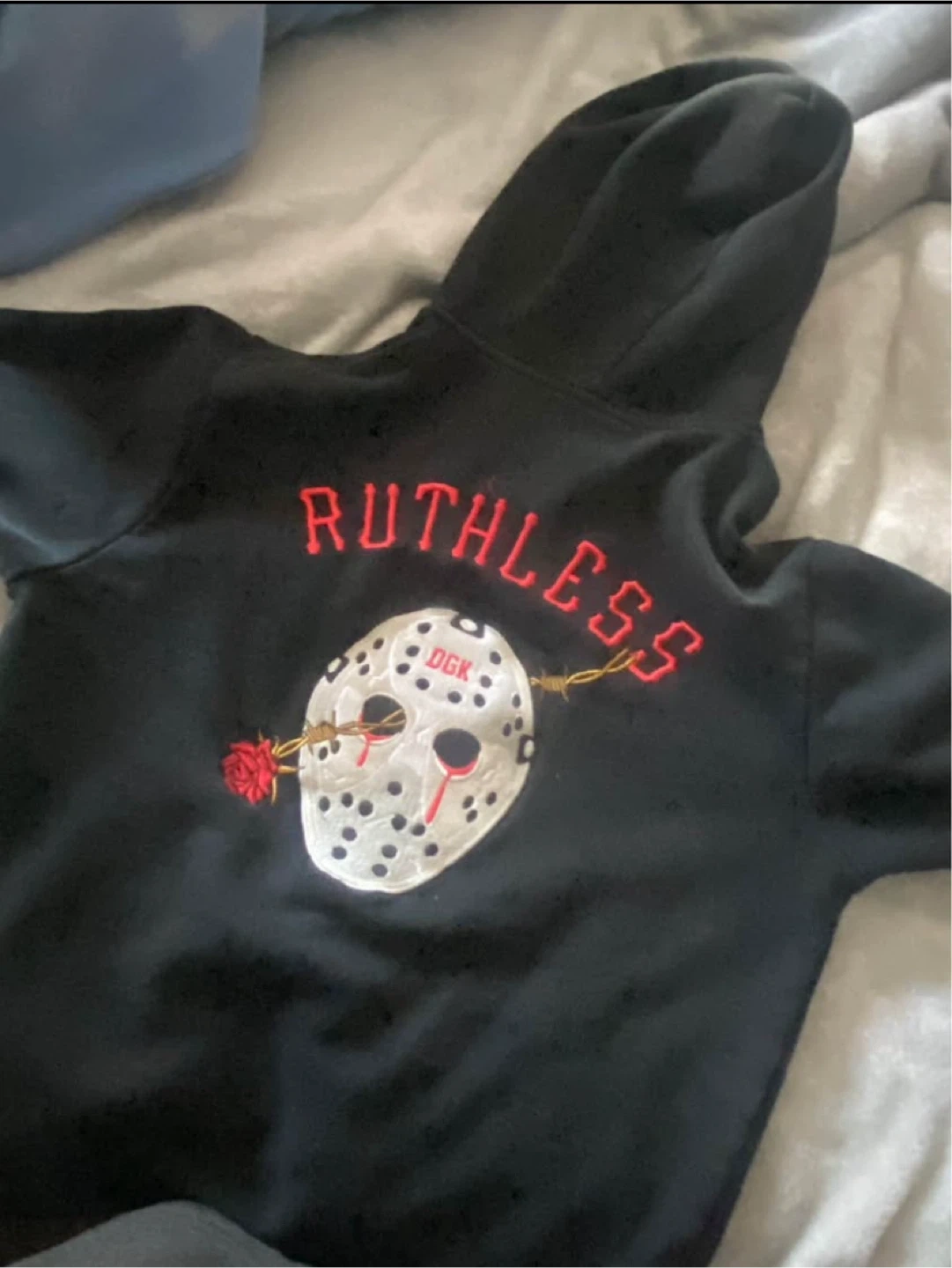 DGK black hoodie with "RUTHLESS" graphic and rose embroidery on the sleeves. It's made of a comfortable material. A cool piece for casual wear!