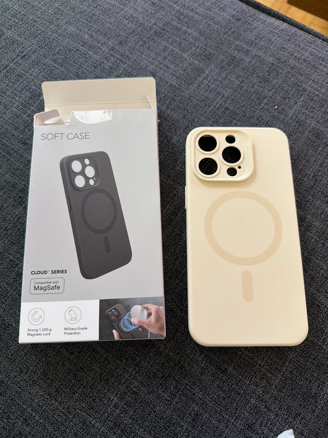 This is a soft case compatible with MagSafe. It offers military-grade protection and a strong magnetic lock. The case is light beige in colour.