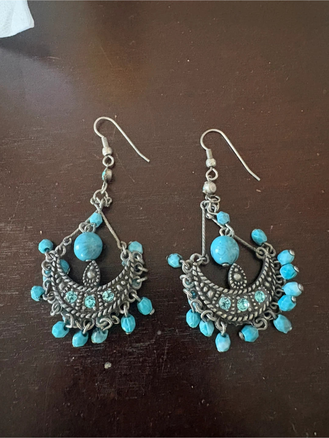 A collection of unique earrings, including chandelier-style with turquoise beads and shell details, teardrop-style with turquoise stones, and hoop earrings with metallic accents. Also includes a black and gold anchor pendant necklace on a gold-tone chain.
