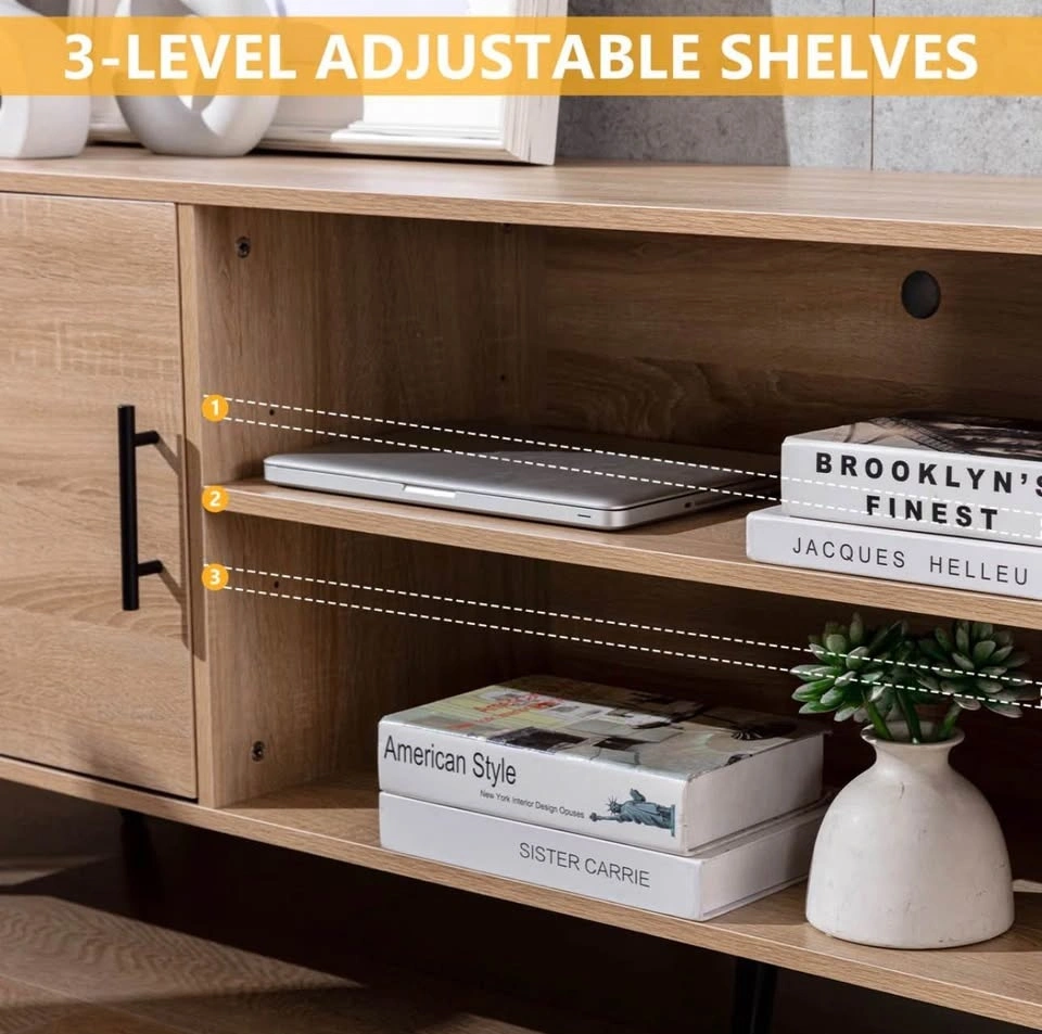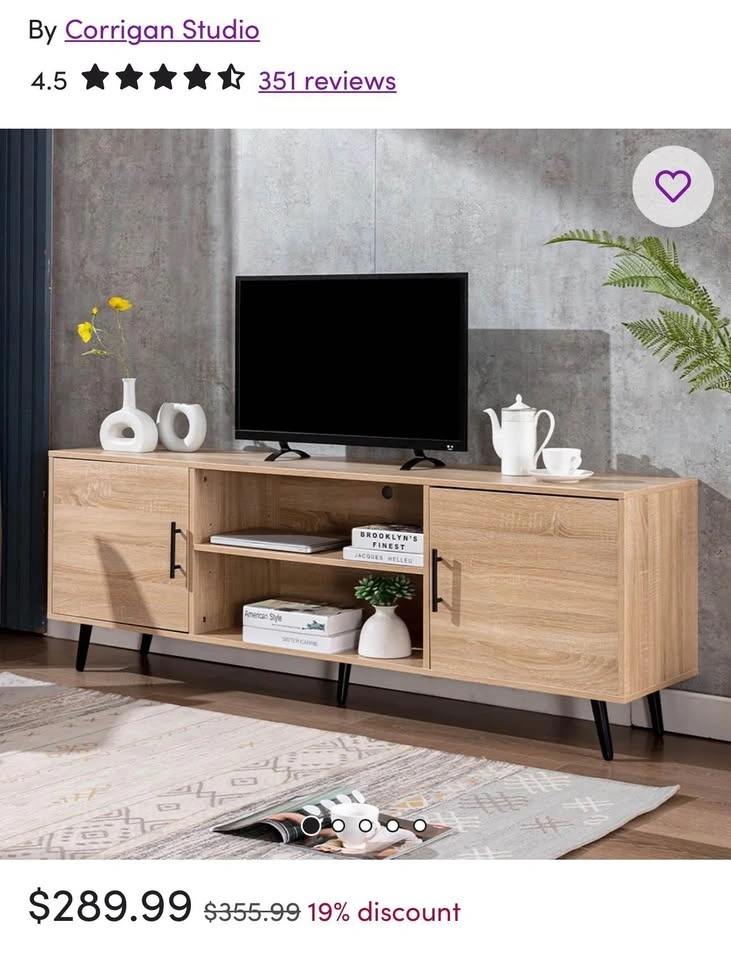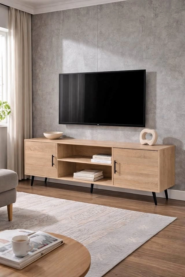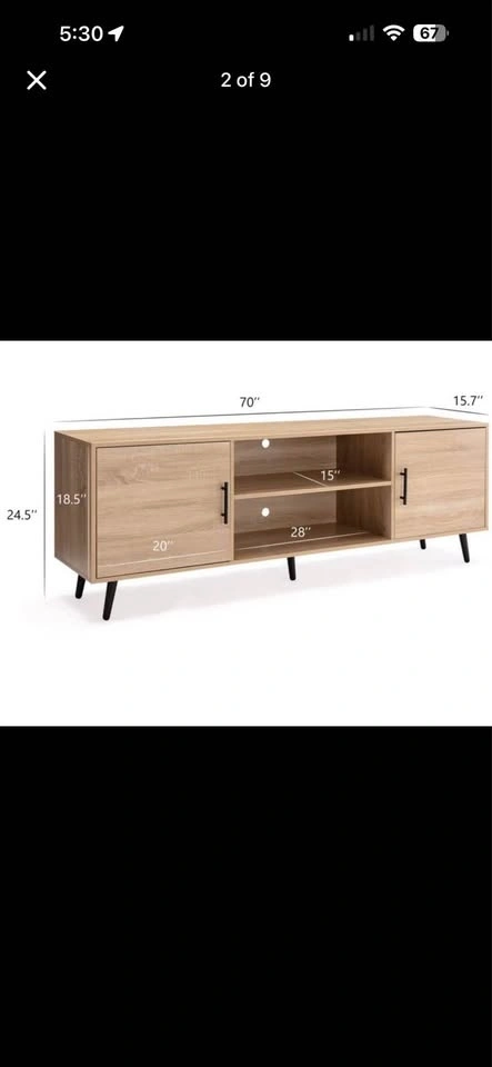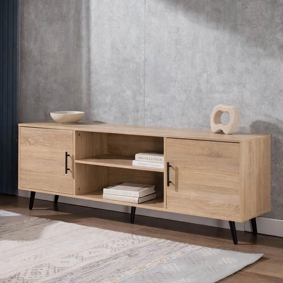 Mid Century modern media console with a warm oak finish and sleek black hardware. Spacious storage with two cabinets and open shelving — perfect for condos or living rooms. Priced competitively for a Brand New Unit.