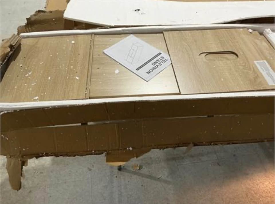 Mid Century modern media console with a warm oak finish and sleek black hardware. Spacious storage with two cabinets and open shelving — perfect for condos or living rooms. Priced competitively for a Brand New Unit.