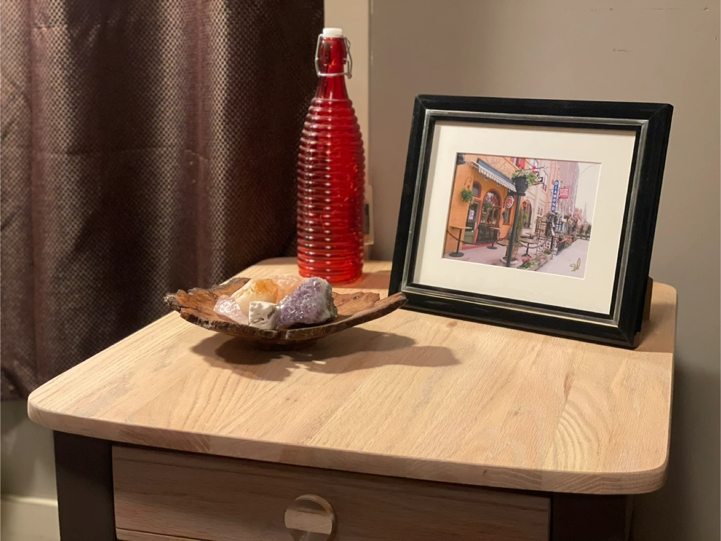 Tops and side table drawer - sanded and paint wash was done with Country Chic’s Cheesecake, Tiger’s Eye (glaze), and Cut a Rug. Then sanded back and wash colours remain in grain of wood. Sealed with Water Based Varathane
