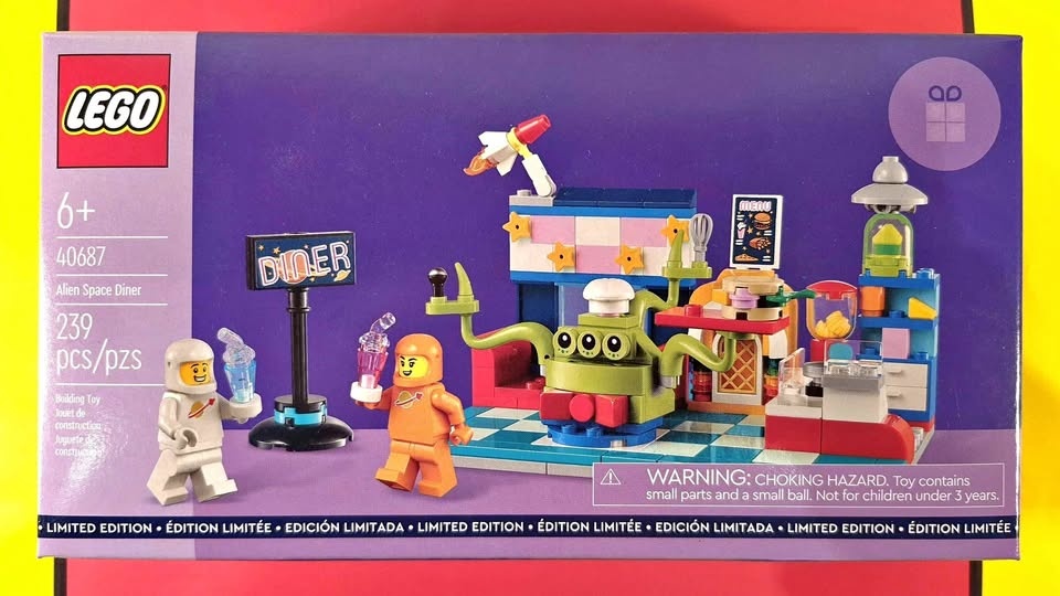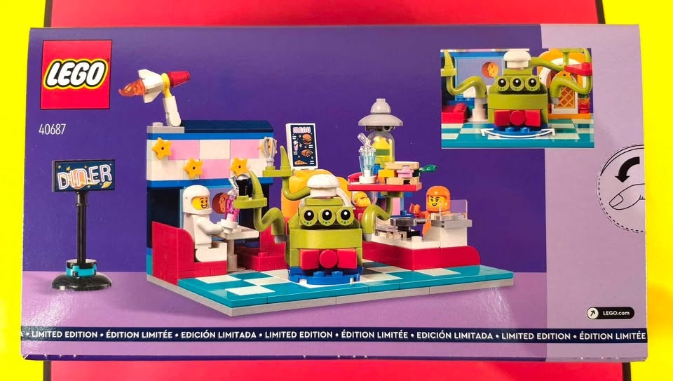 Build a cool space toy for kids aged 6+ with the LEGO Alien Space Diner (40687), featuring a kitchen area, dining section with jukebox, diner sign, and milkshakes to spark intergalactic adventures. Includes 2 astronaut minifigures in orange and white suits, plus an alien waiter figure for role-play like ordering burgers or sipping shakes by a planetary window. This 239-piece promotional set measures 5 in. (13 cm) high, 8 in. (20 cm) wide, and 4 in. (10 cm) deep, making it a stellar display or play piece.
