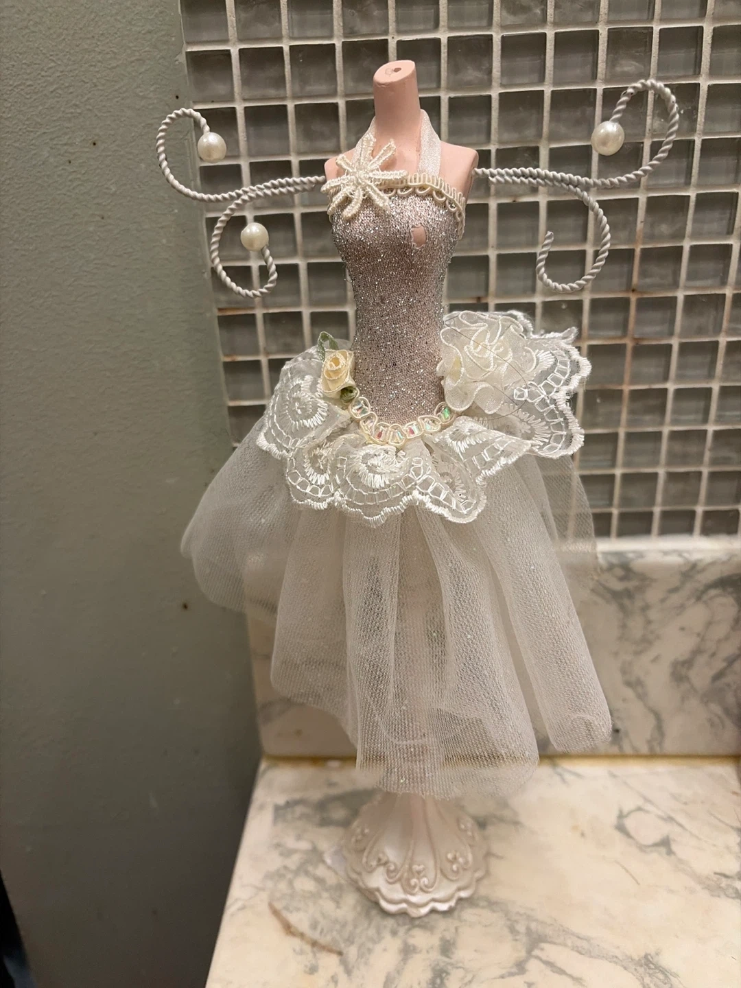 This is a lovely display mannequin featuring a sparkly bodice and a layered tulle skirt, adorned with delicate flowers and pearls. It's perfect for showcasing jewelry or small accessories.