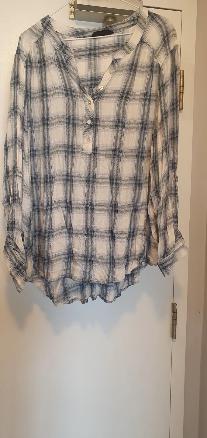 This is a white and blue plaid long sleeve shirt. It features a button-up front and a V-neckline with a small collar. The fabric appears to be lightweight and breathable.
