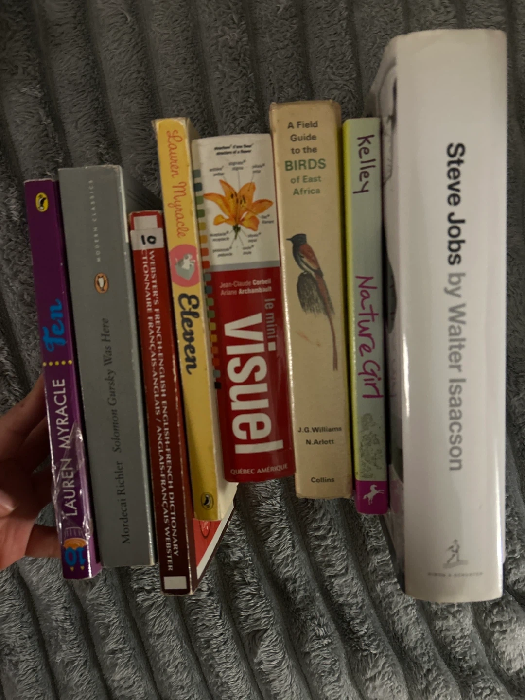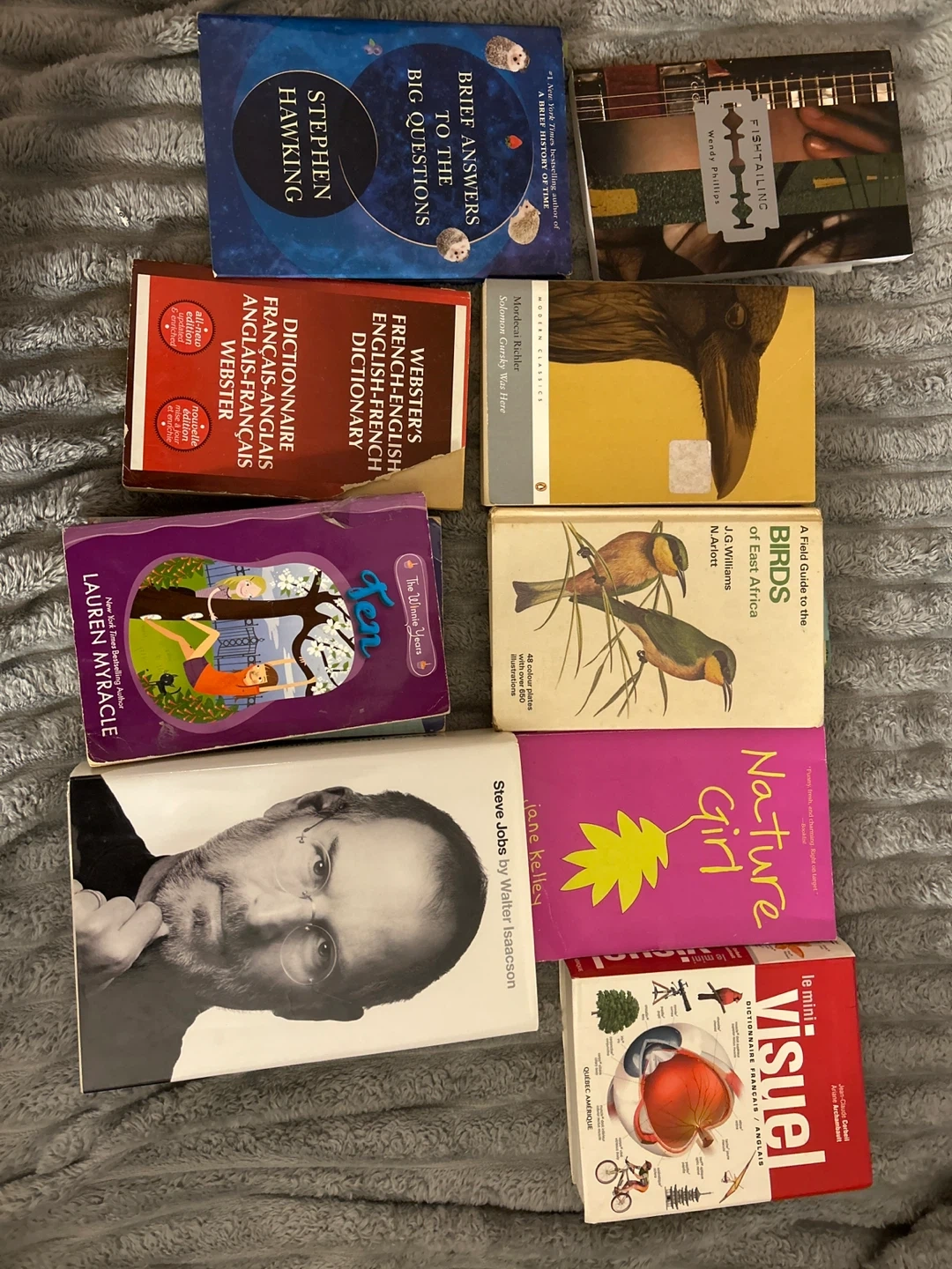 This lot includes a biography of Steve Jobs by Walter Isaacson and "Nature Girl" by Jessica Francis Kane. You'll also find Stephen Hawking's "Brief Answers to the Big Questions" and a "French-English English-French Dictionary" by Merriam-Webster. Additional titles include "Ten" by Lauren Myracle, "Fever 1793" by Laurie Halse Anderson, "A Field Guide to the Birds of East Africa" by J.G. Williams, and "Visual Quebec" magazine.