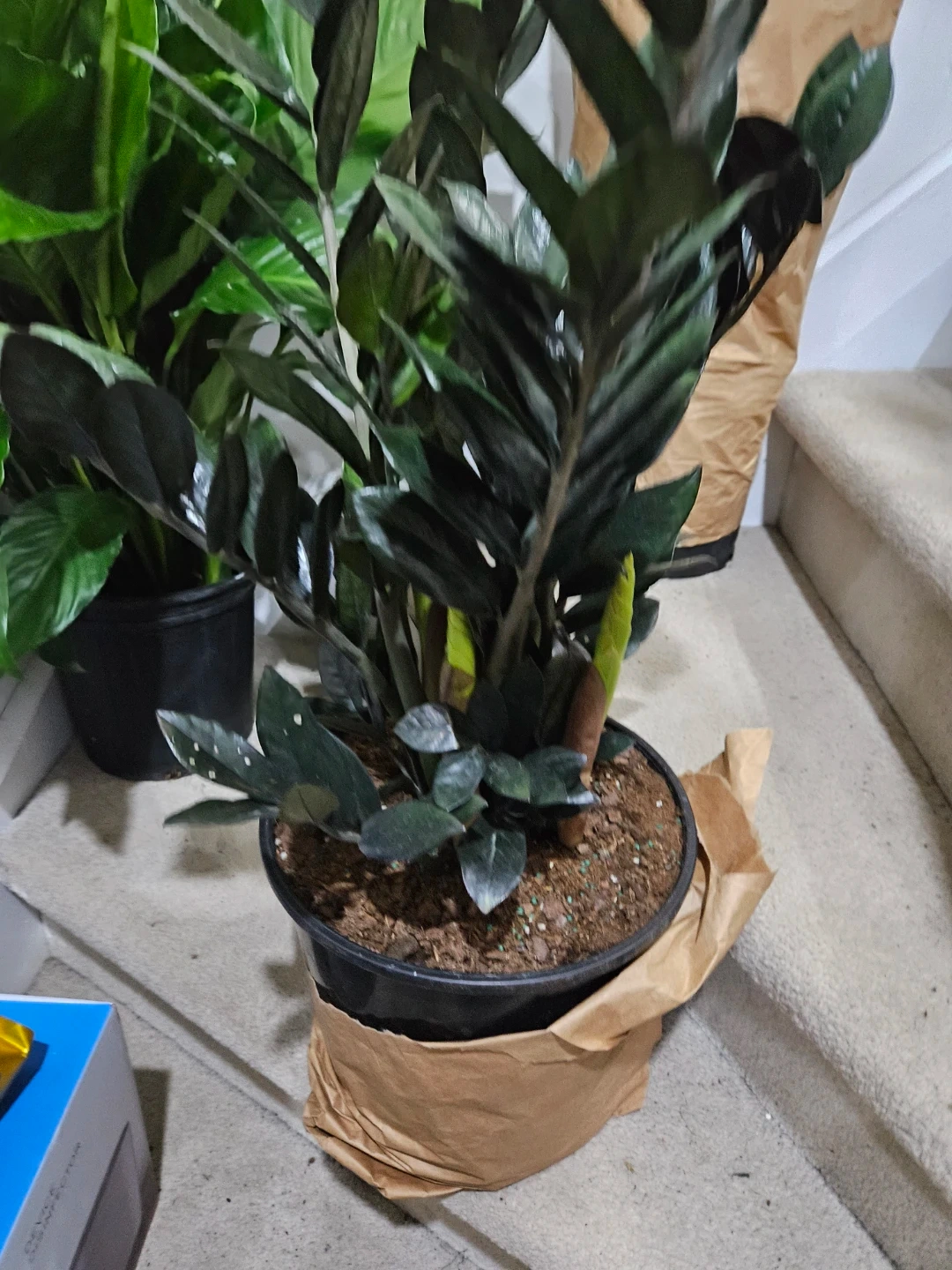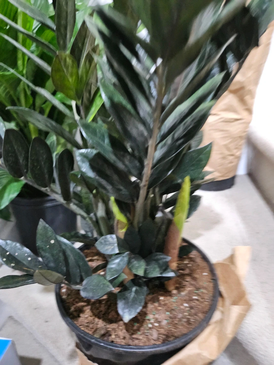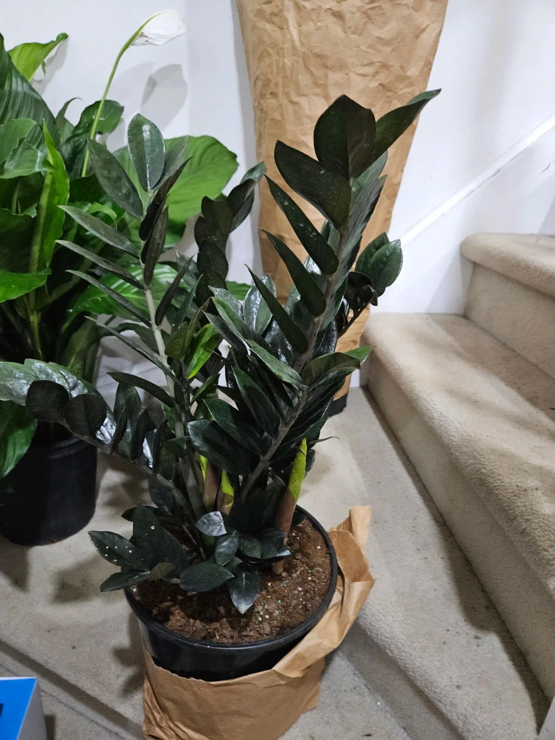 Dark green ZZ plant in a black pot. It's a low-maintenance houseplant known for its attractive glossy leaves. Comes with original brown paper wrapping.