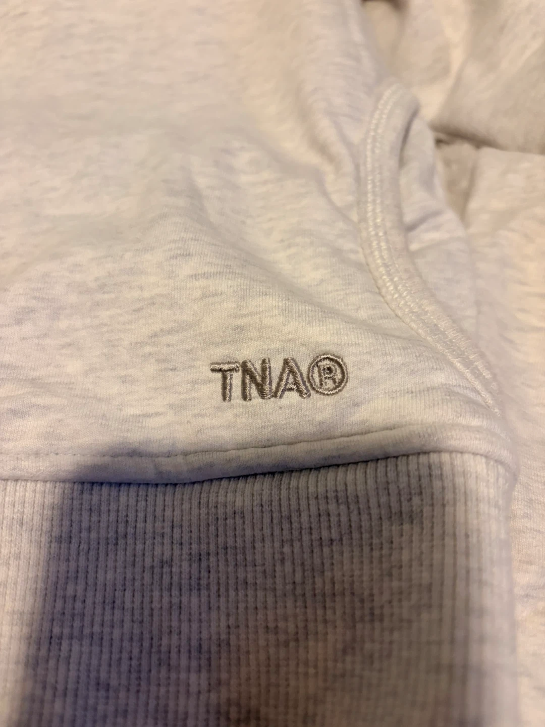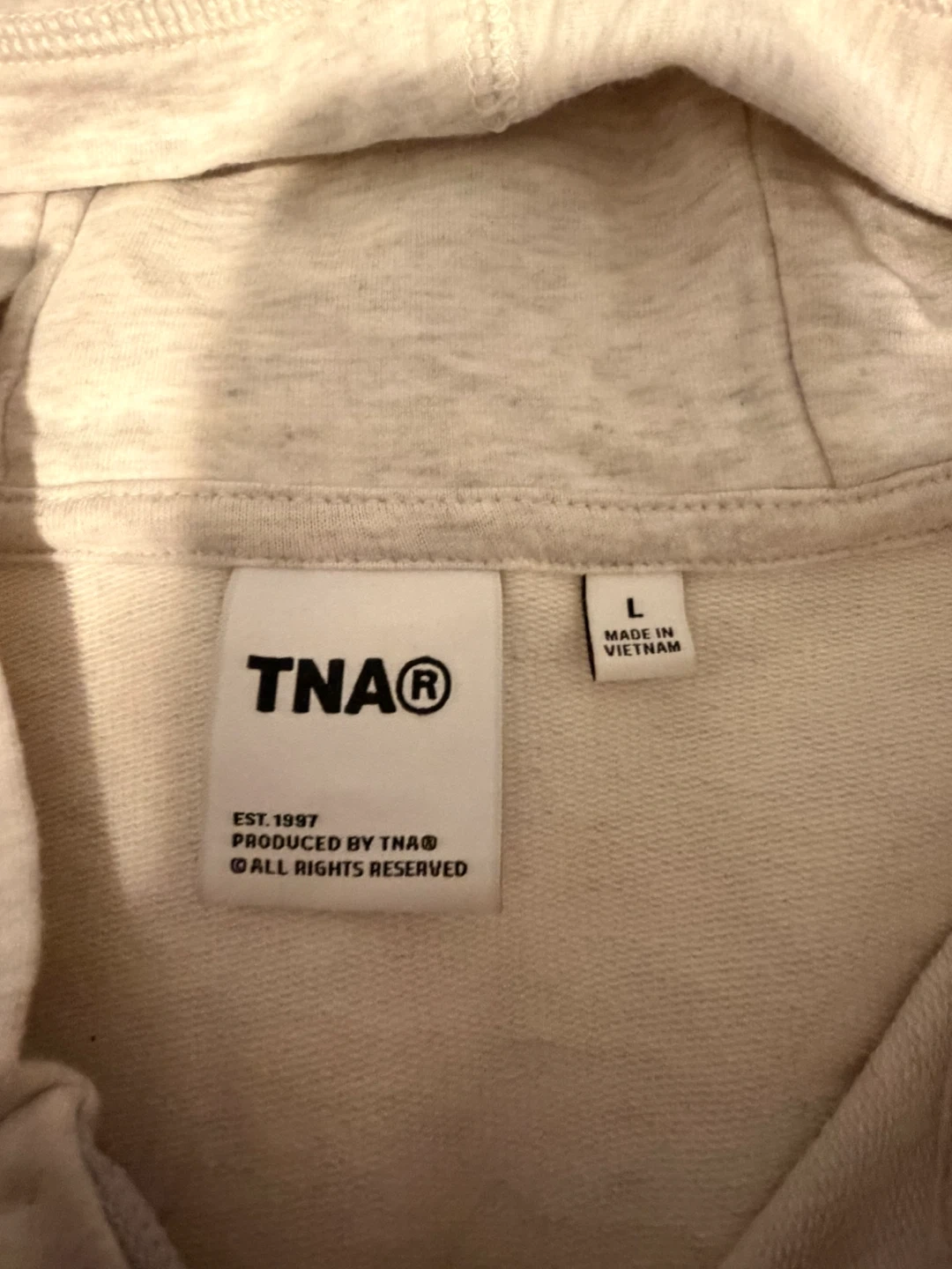 This is a light heather grey TNA zip-up hoodie. It's made of a soft cotton blend and has a size L tag. Made in Vietnam.