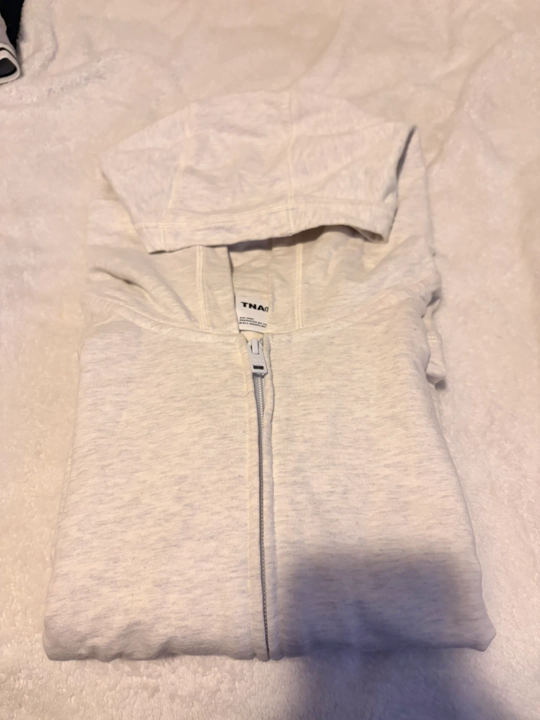 This is a light heather grey TNA zip-up hoodie. It's made of a soft cotton blend and has a size L tag. Made in Vietnam.