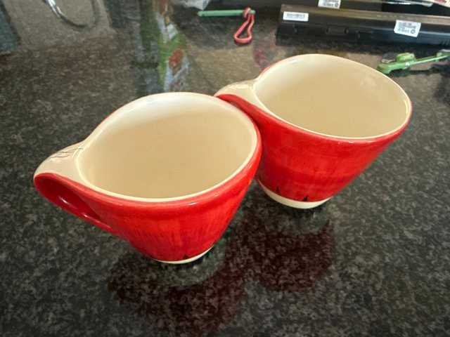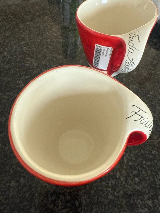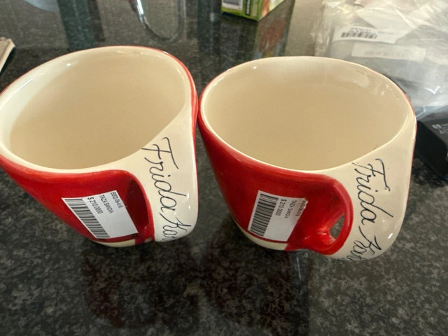 This is a listing for two Frida Kahlo mugs. They are in like-new condition. Here are some details about the mugs: * Design: Frida Kahlo-inspired * Material: Ceramic * Condition: Like new * Quantity: 2 mugs If you're reading this, they're still up for grabs!
