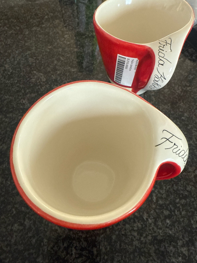 This is a listing for two Frida Kahlo mugs. They are in like-new condition. Here are some details about the mugs: * Design: Frida Kahlo-inspired * Material: Ceramic * Condition: Like new * Quantity: 2 mugs If you're reading this, they're still up for grabs!