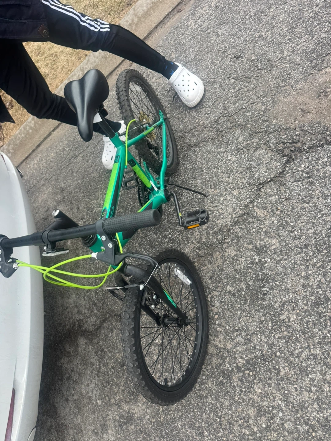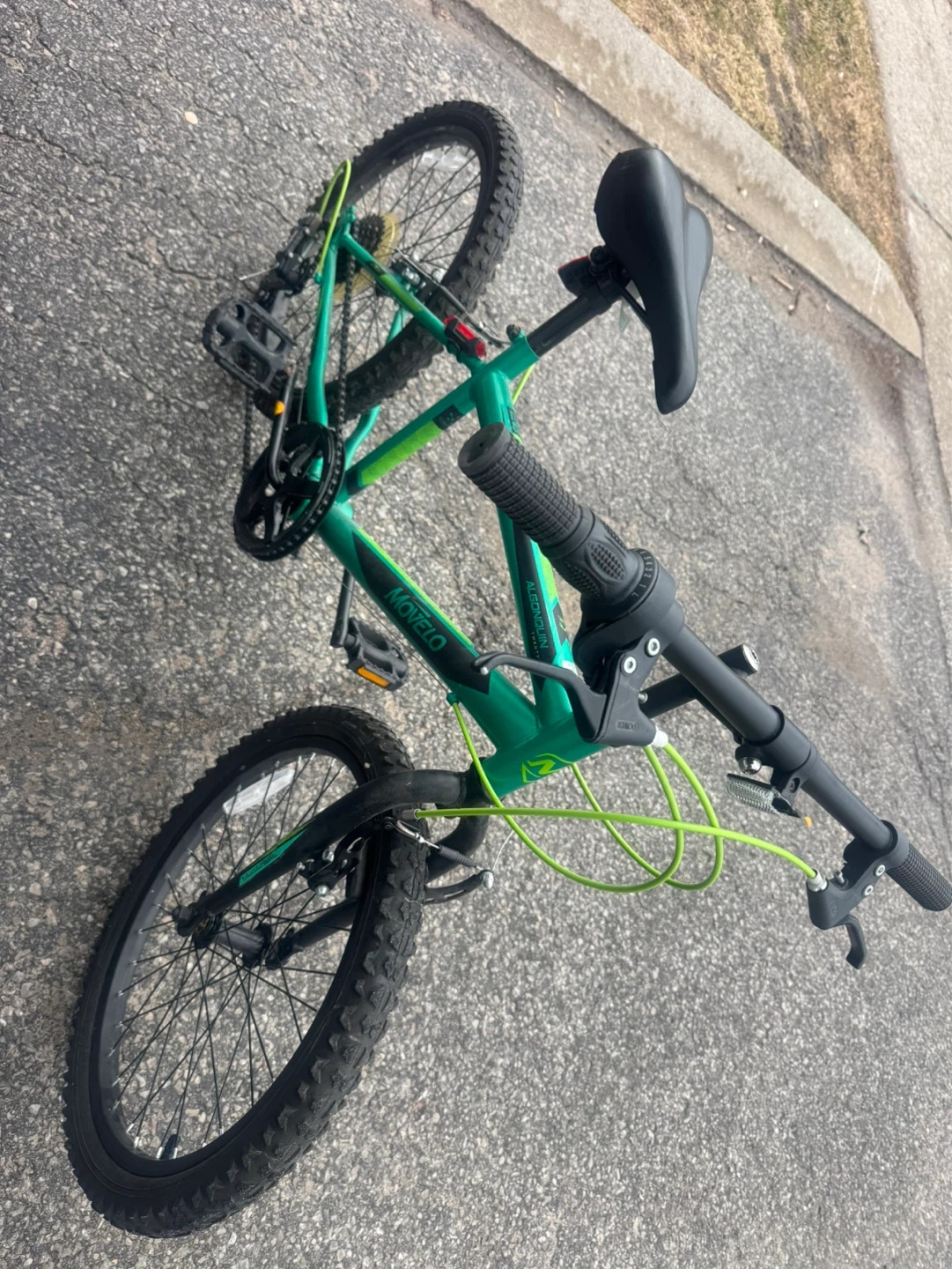 This is a green Movelo bicycle. It has 20-inch wheels and a sturdy frame. Perfect for kids learning to ride or for casual park trips!