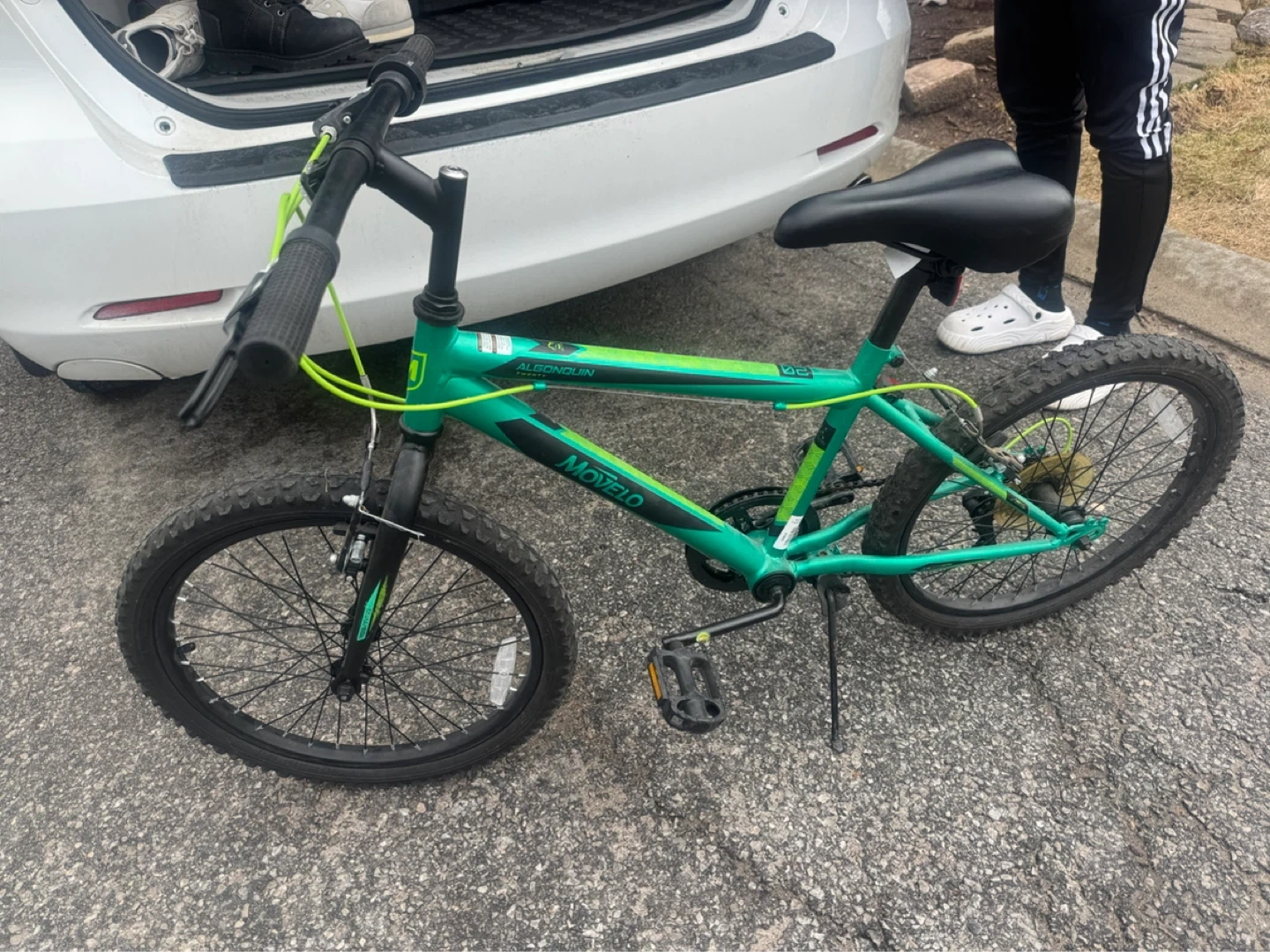 This is a green Movelo bicycle. It has 20-inch wheels and a sturdy frame. Perfect for kids learning to ride or for casual park trips!