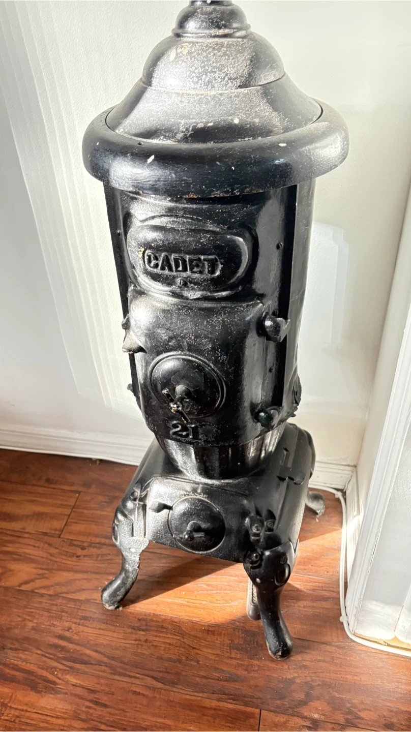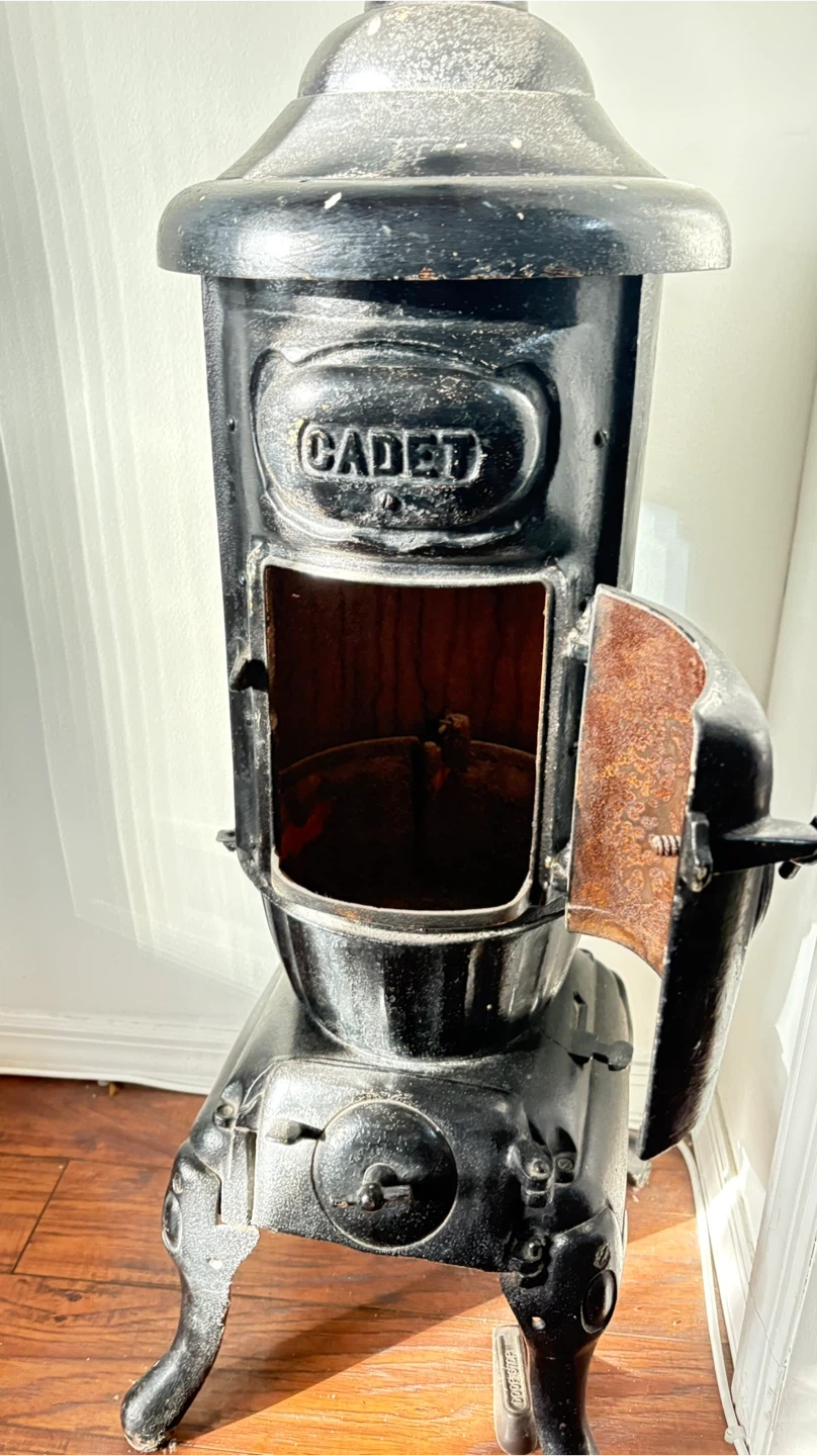 This is a vintage Cadet wood stove made from cast iron. It features decorative detailing and a hinged door. It's a solid piece that would work as a decorative accent.