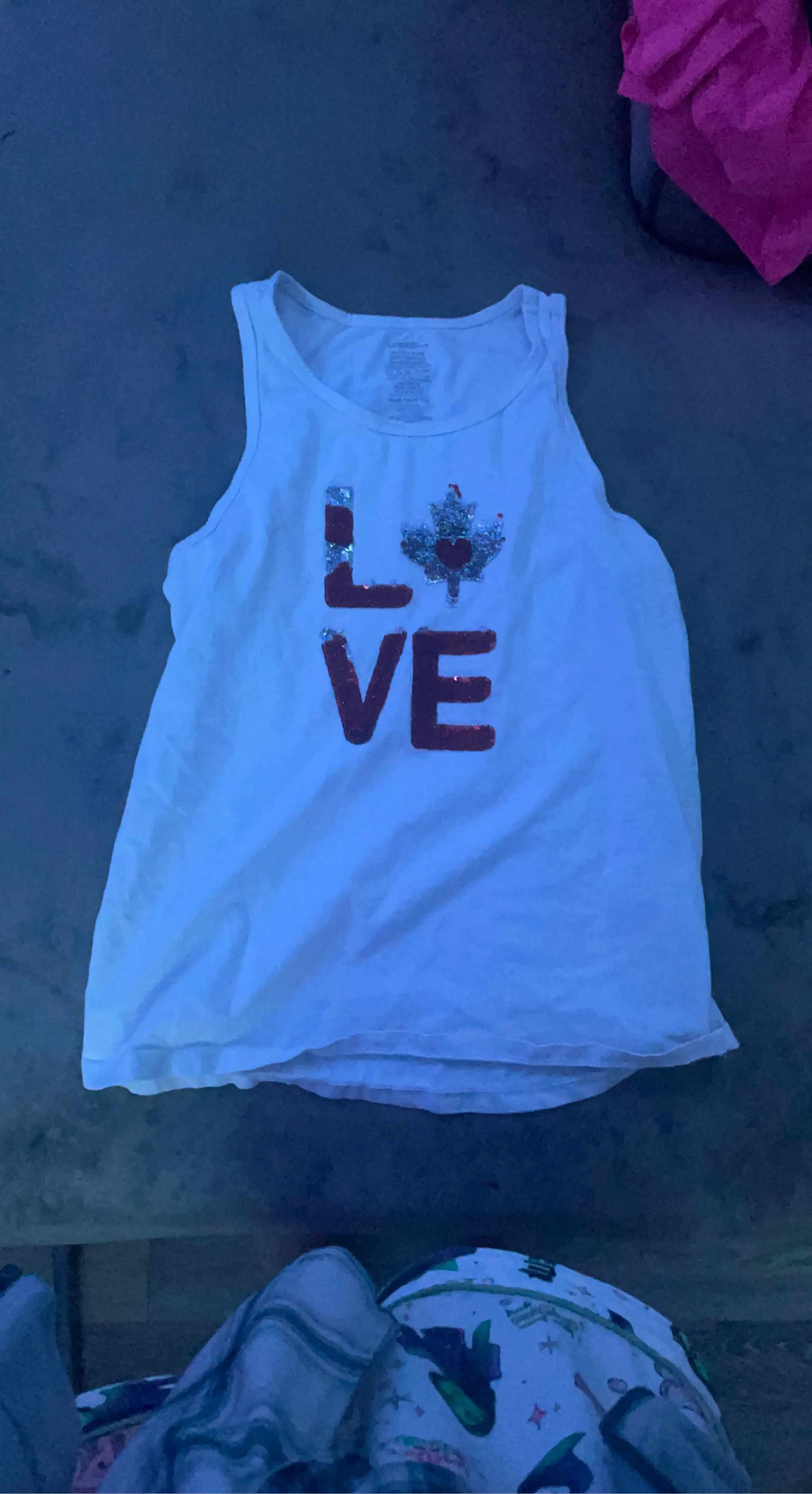 This is a white tank top with sequin 'LOVE' and a sequined maple leaf design. It's a comfortable and festive piece. Great for casual wear or Canada Day celebrations!