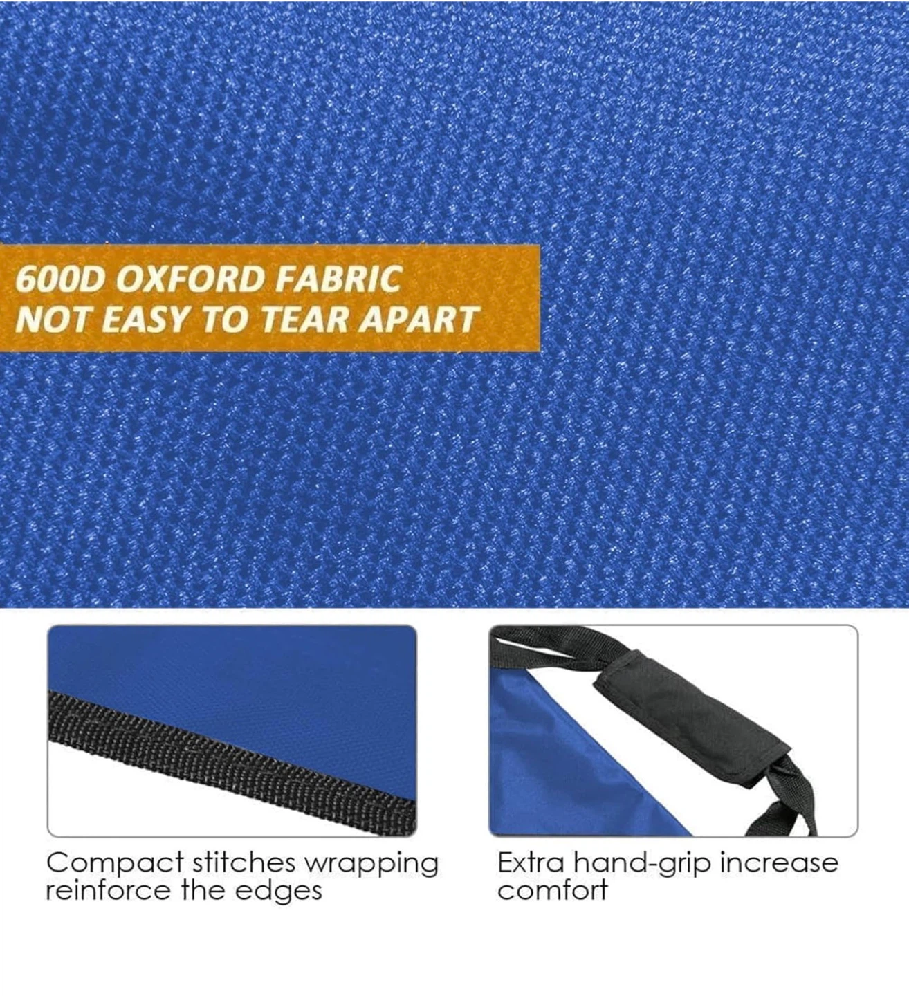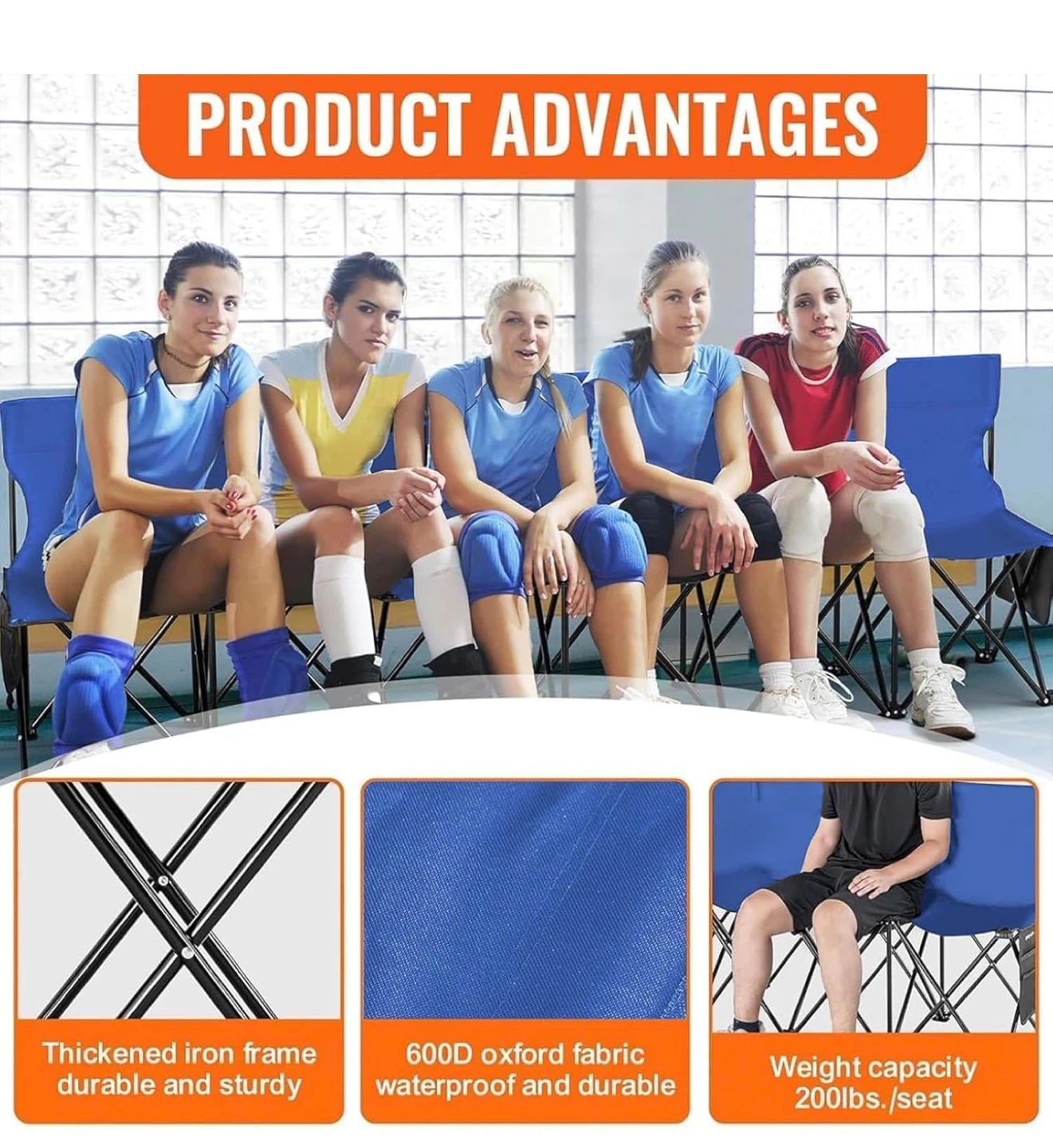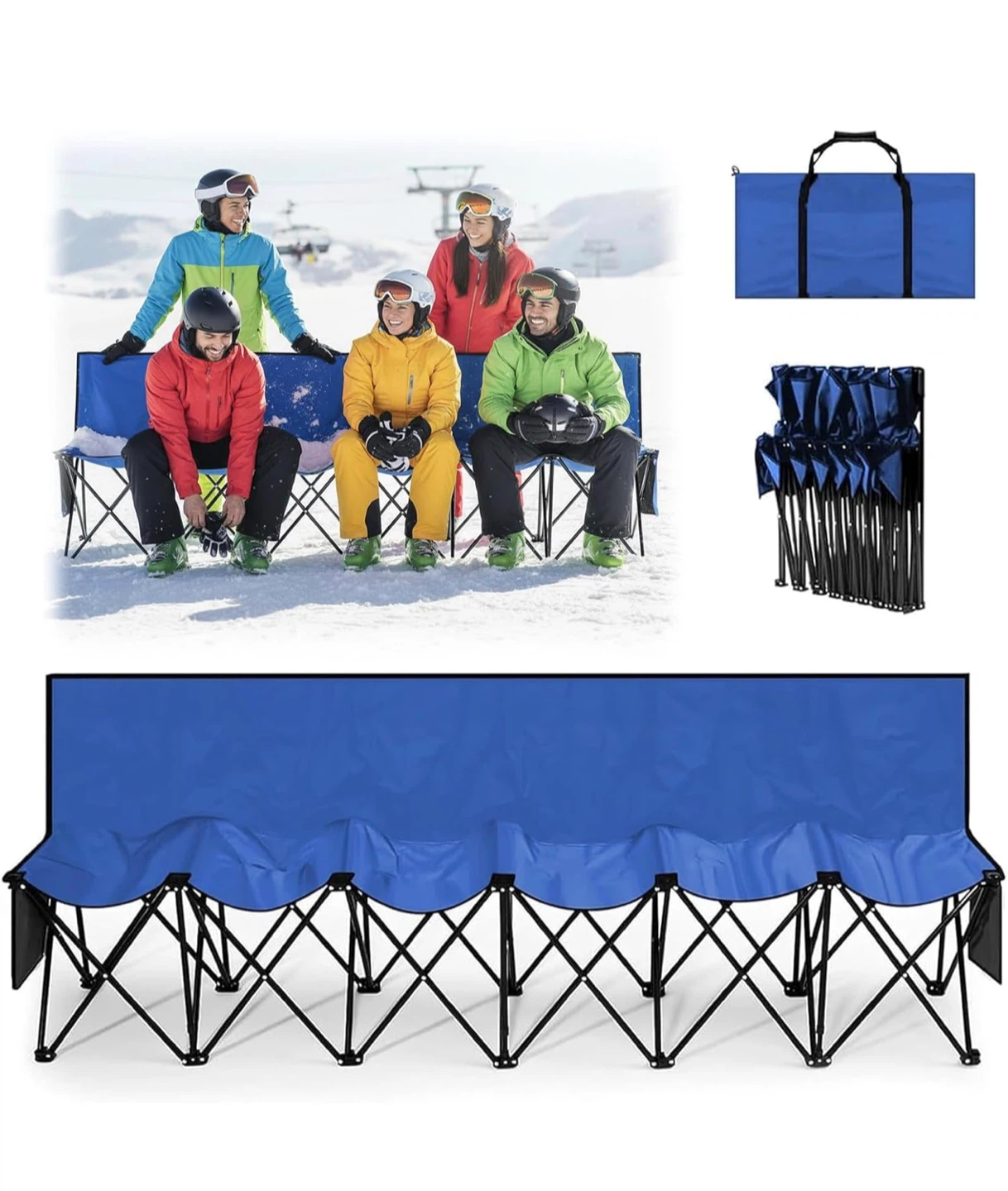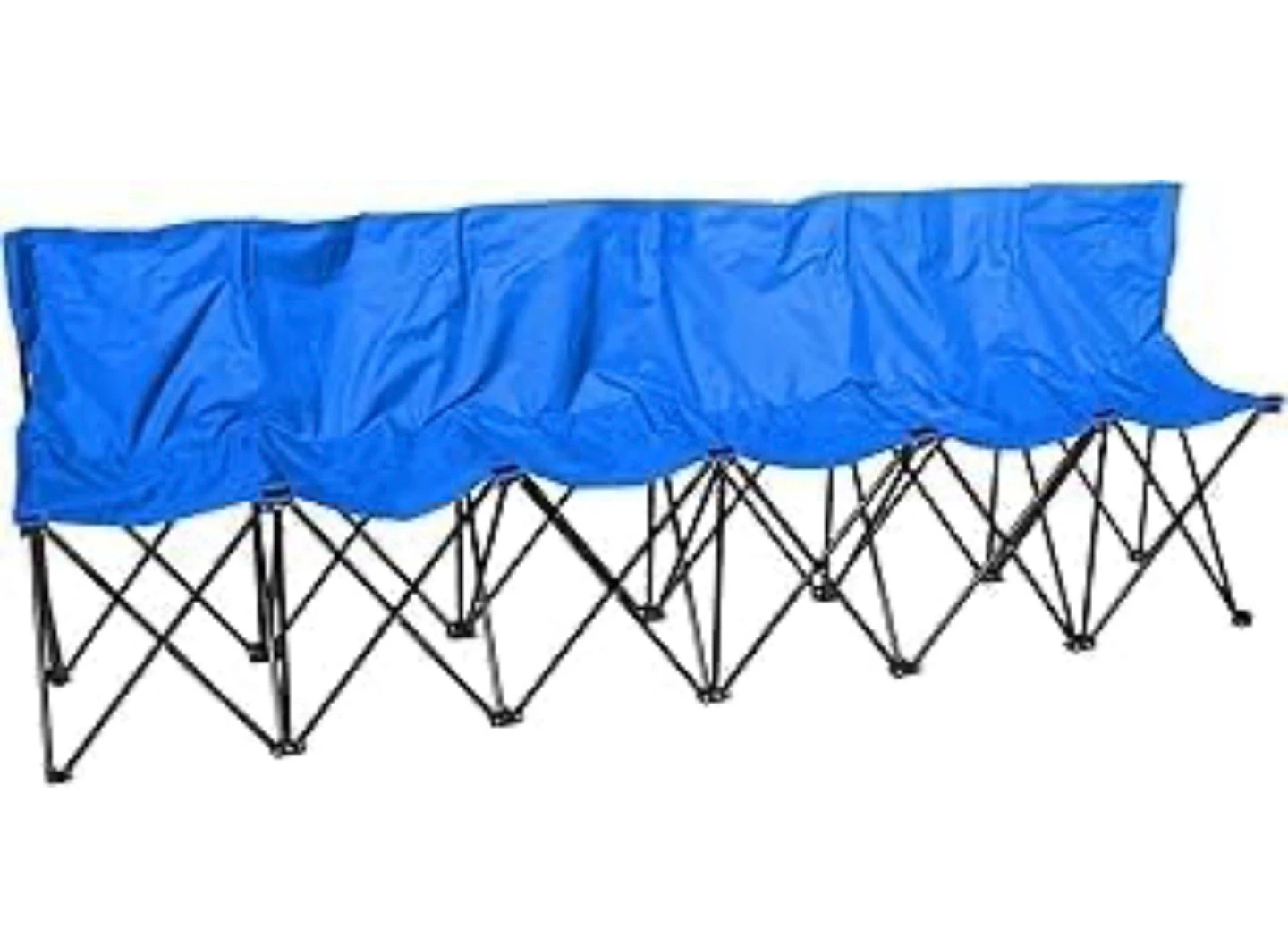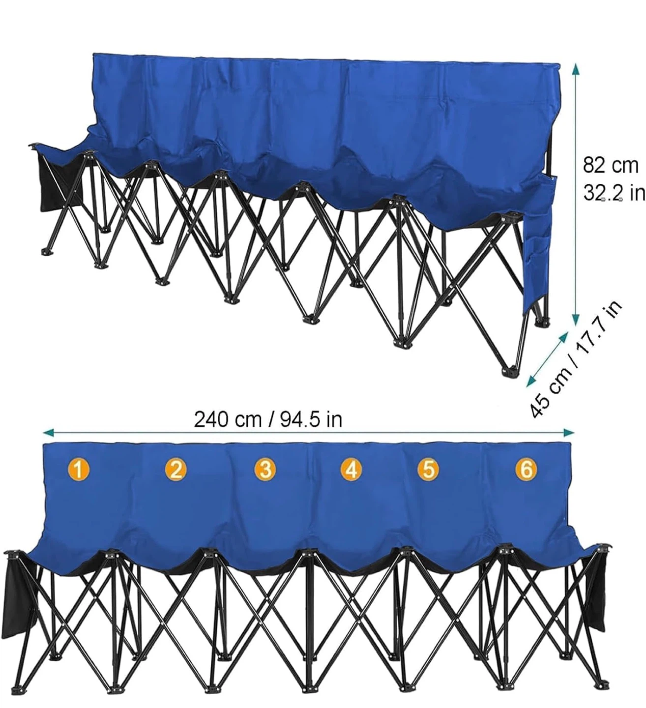 This 6-seater portable bench is made from durable 600D Oxford fabric and features a thickened iron frame for sturdiness. It's waterproof and measures 240 cm long, 82 cm high, and 45 cm deep. The extra hand-grip increases comfort during transport. Perfect for outdoor events or team seating!