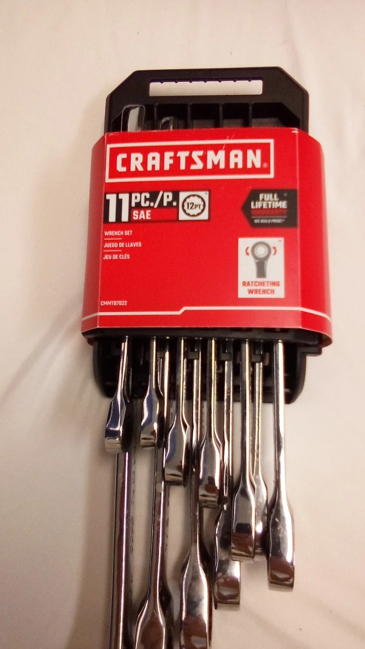 This is an 11-piece SAE wrench set from Craftsman. It includes a ratcheting wrench design for easier use. Sizes range from 1/4-inch to 7/8-inch.