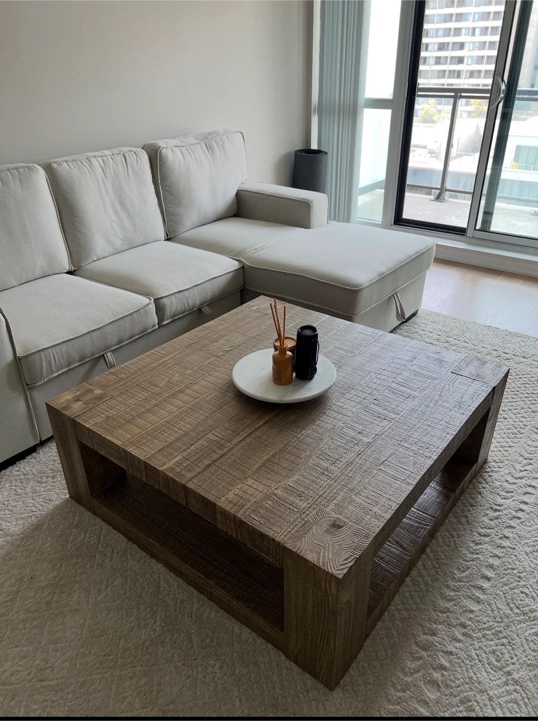 This is a solid wood coffee table with a rustic finish. It features an open shelf for storage. Its substantial size makes it a great centerpiece for any living room. Table is heavy and so you will need to organise and pay for its delivery. Serious inquiries only.