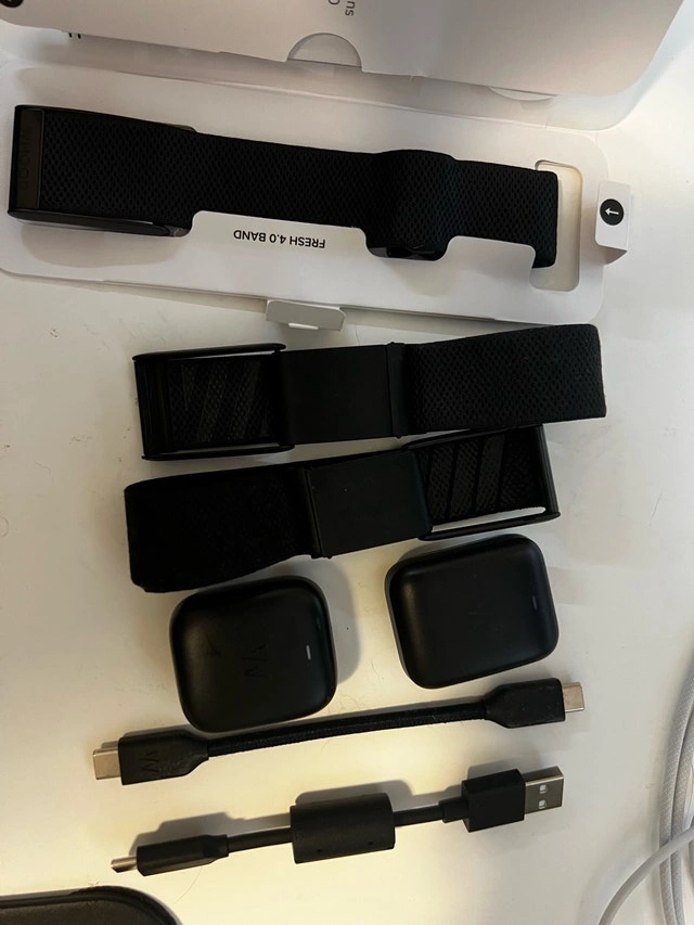 Includes two battery packs, three bands (one brand new), and two charging cables.
