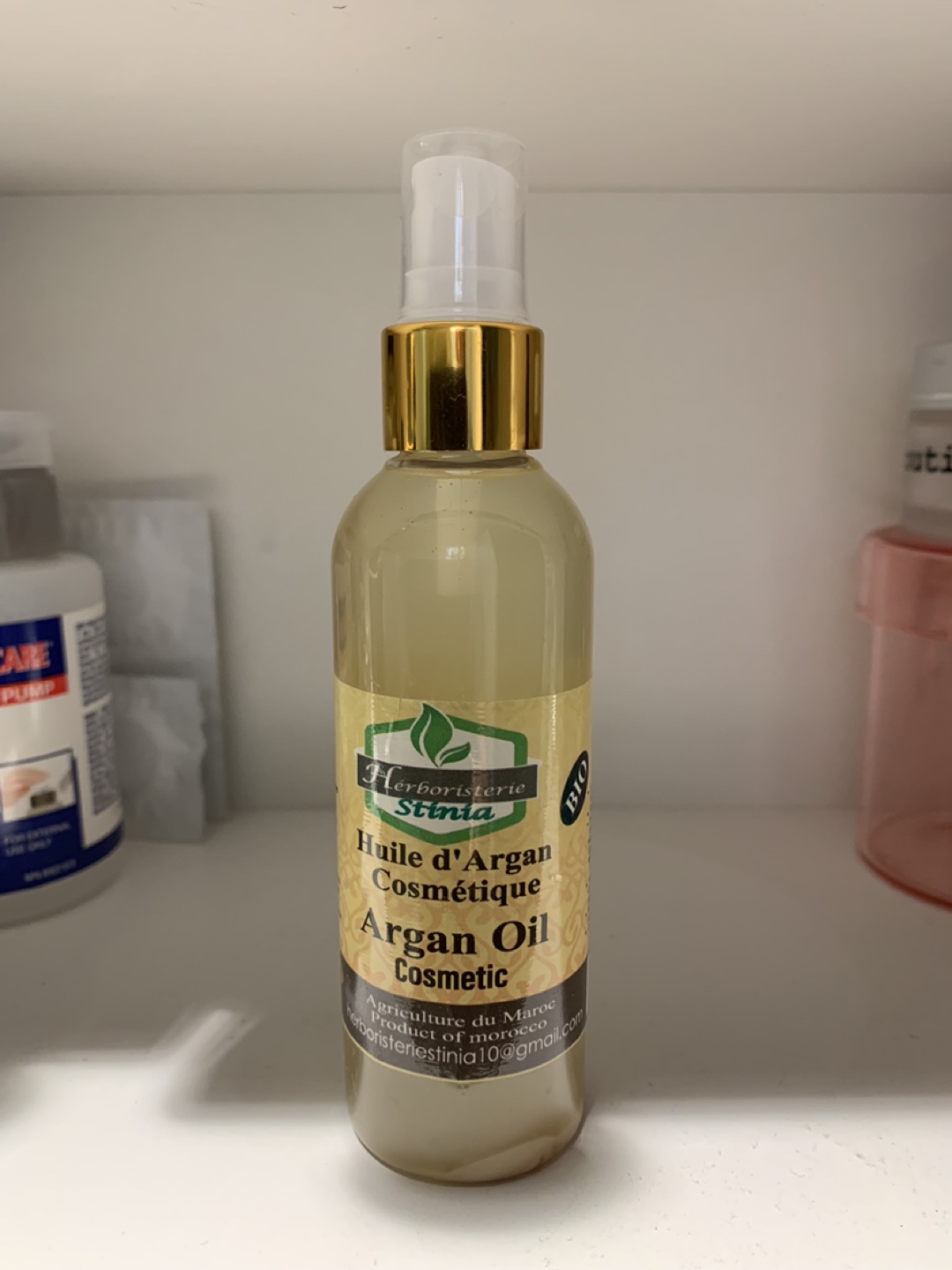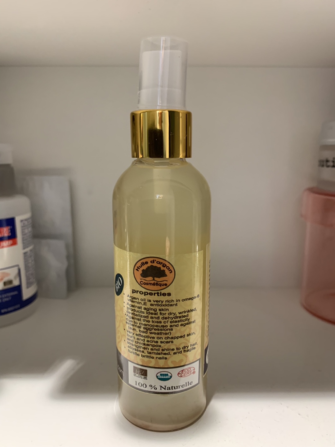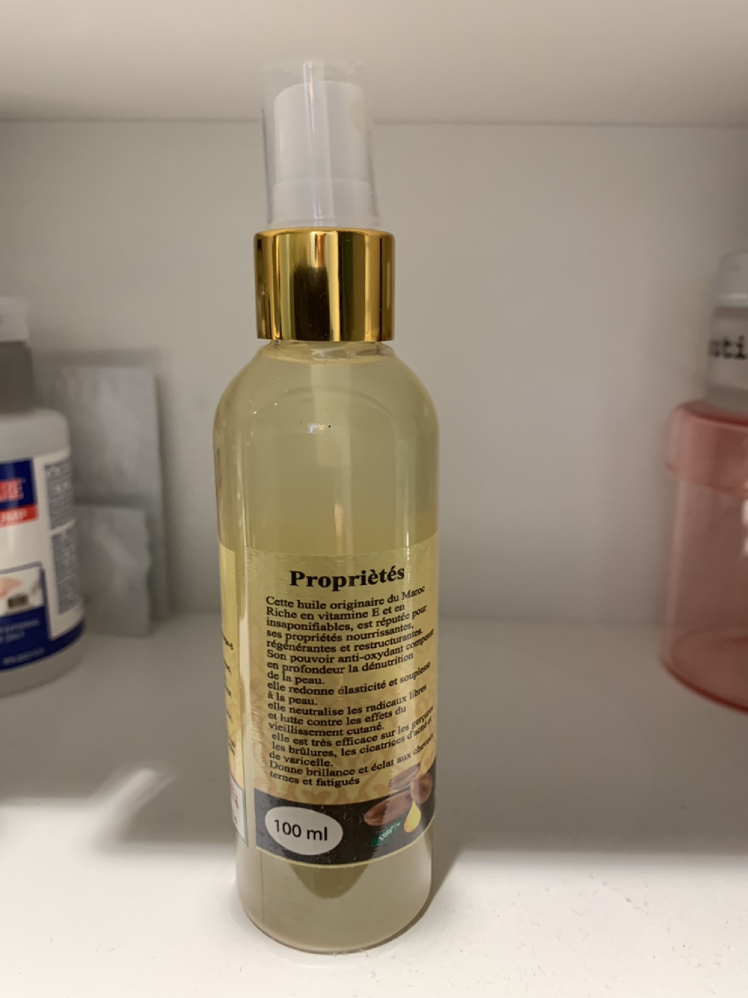 100% natural cosmetic argan oil. Product of Morocco. Spray bottle. Nourishes and softens skin. Good for dry, wrinkled, and brittle skin and hair.
