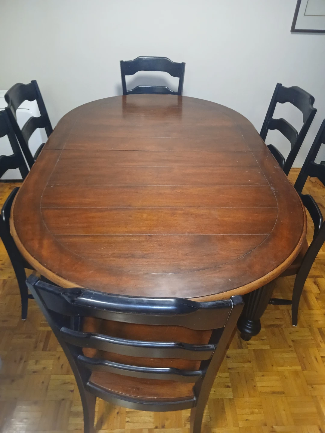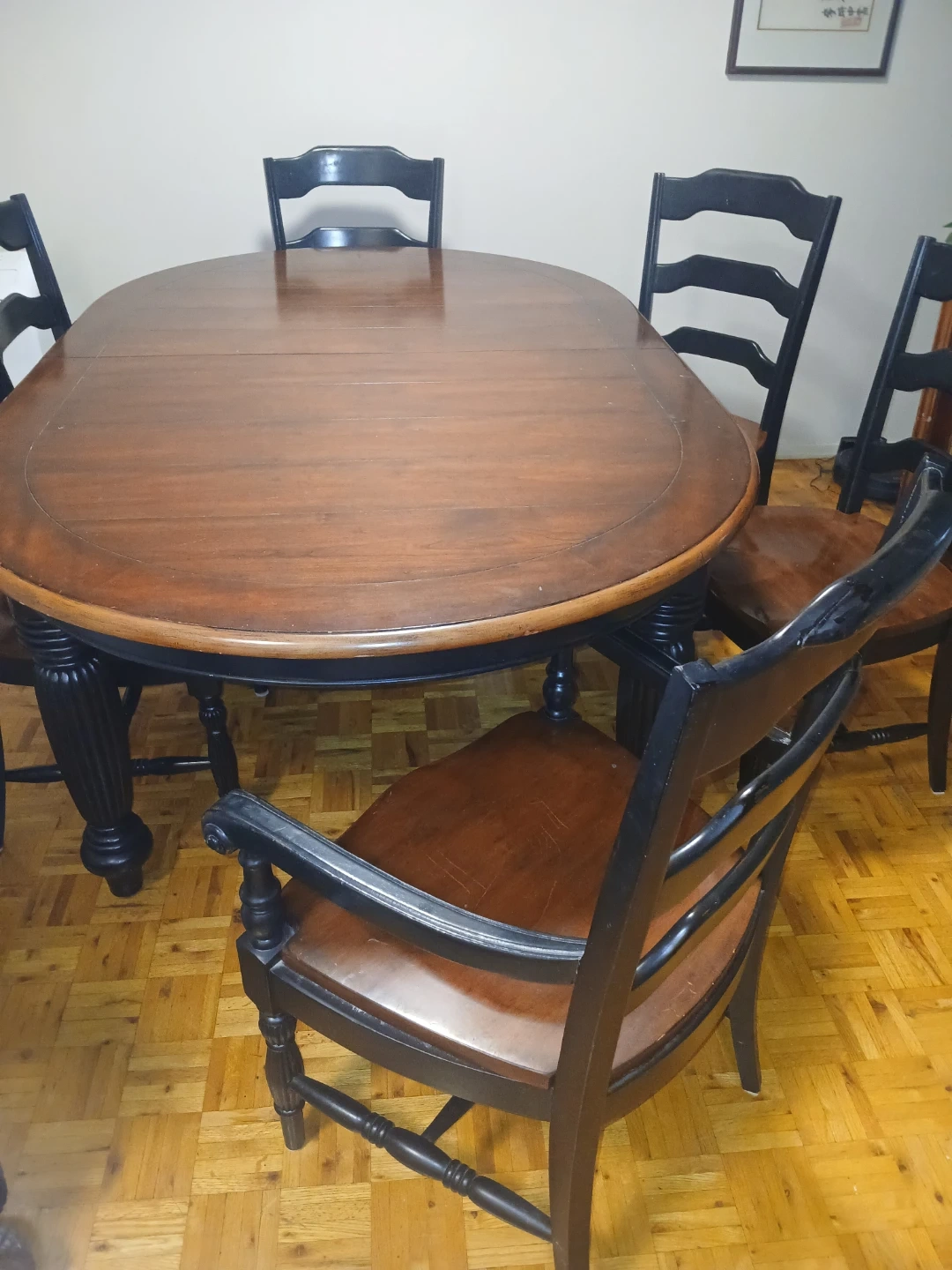 A classic oval-shaped dining table with six matching chairs. The table features a rich wood finish on top with a contrasting black base. Chairs have slatted backs and wooden seats. This set is perfect for family dinners or entertaining guests.