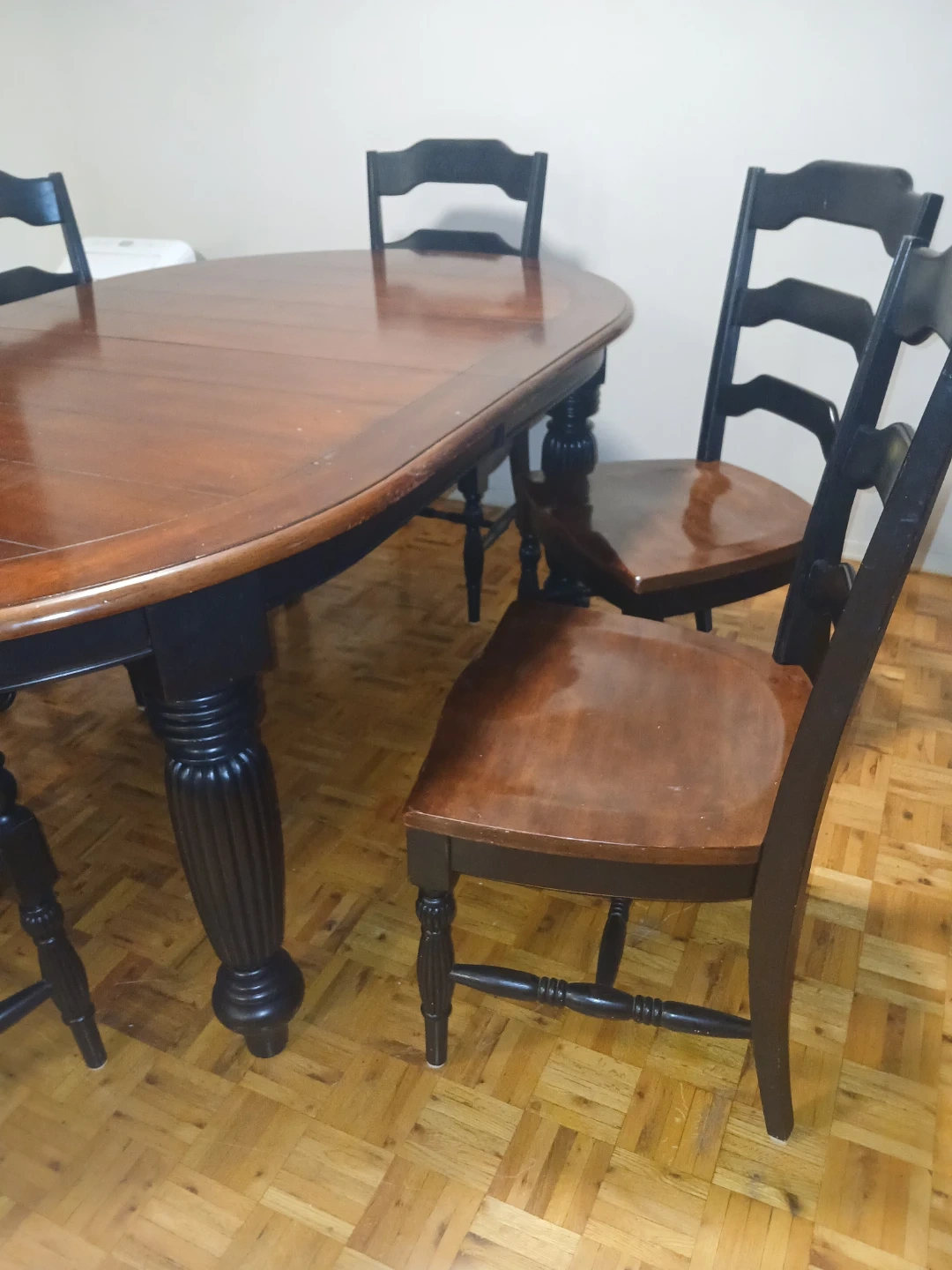A classic oval-shaped dining table with six matching chairs. The table features a rich wood finish on top with a contrasting black base. Chairs have slatted backs and wooden seats. This set is perfect for family dinners or entertaining guests.