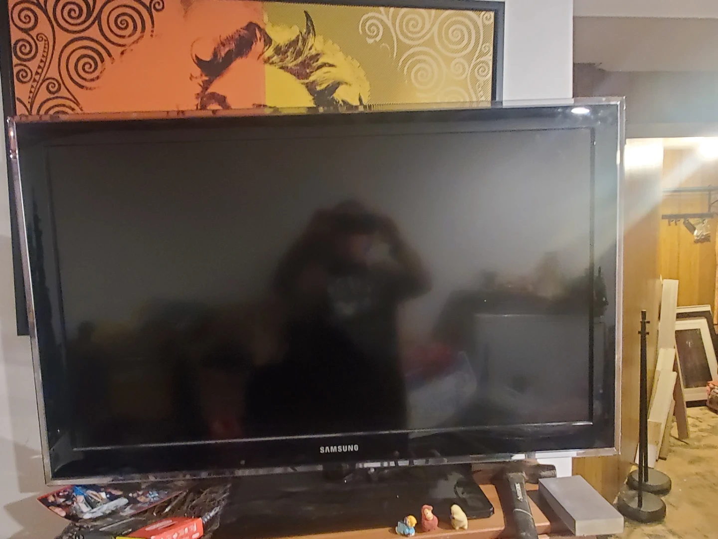 Samsung flat screen television. Black bezel. It's a good size for a living room or bedroom. Perfect for movie nights!