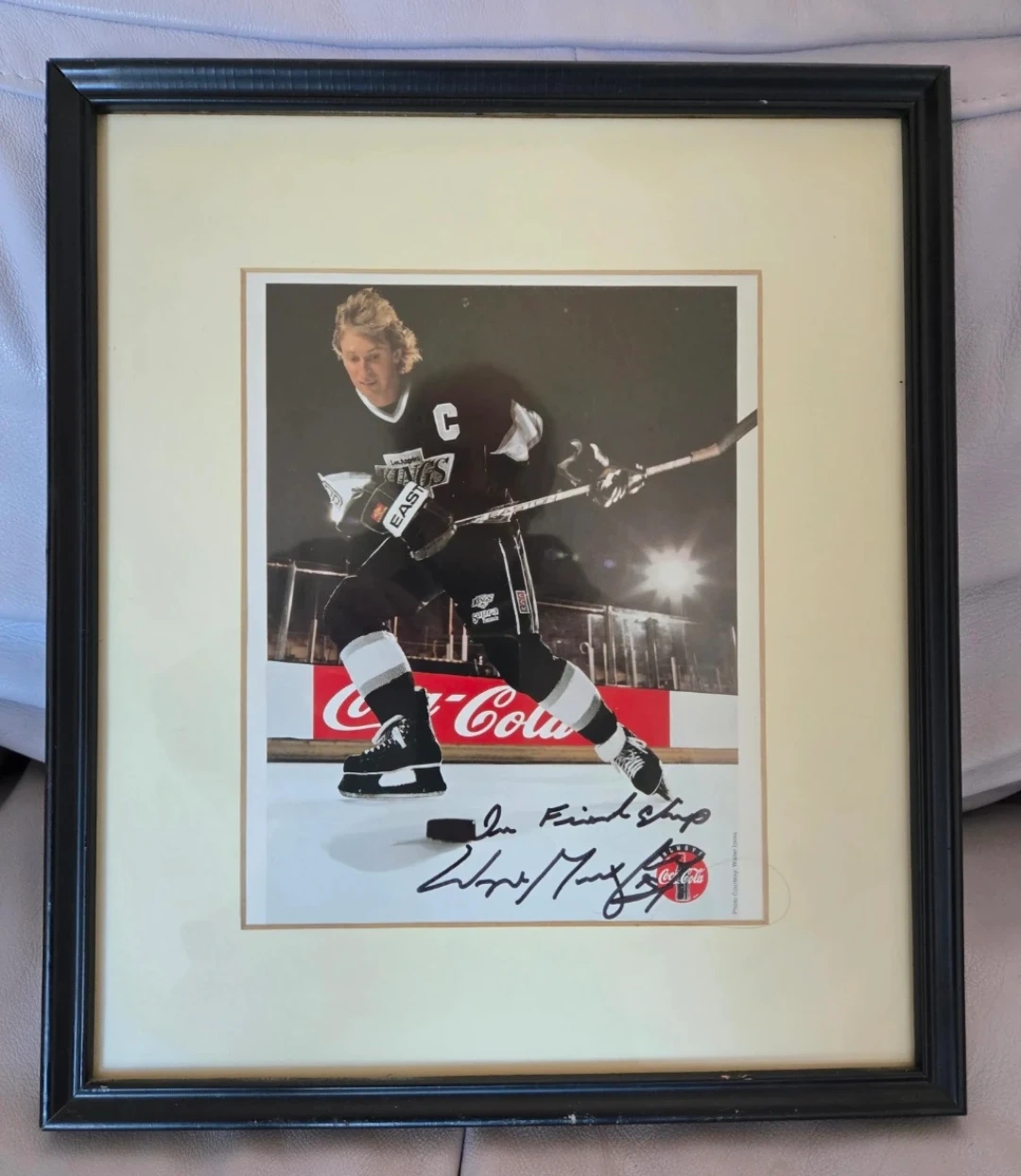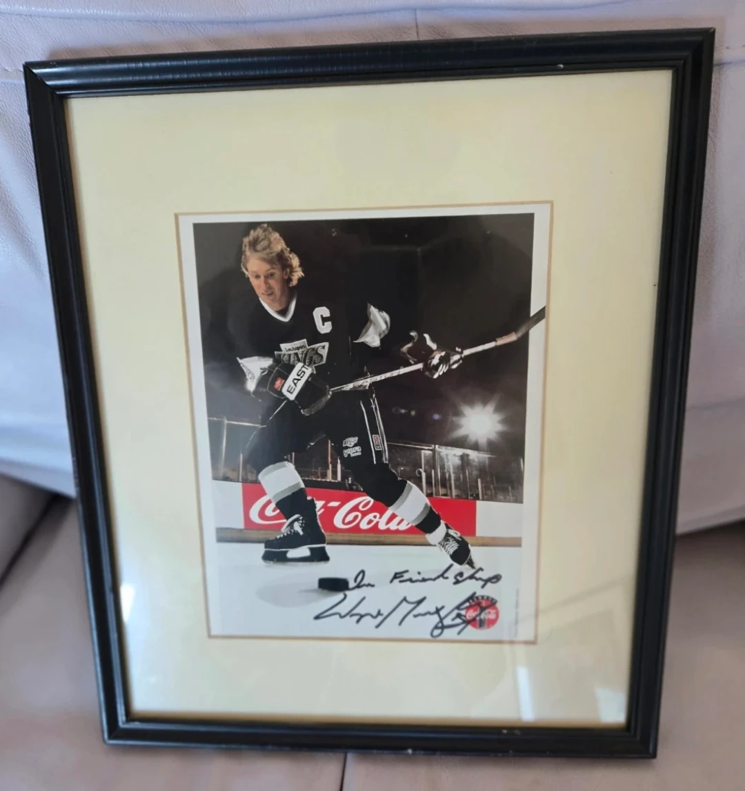 A rarity! Personally signed "In Friendship" 8"Γ10" photo of the Great One when he was playing for the L. A. Kings. Matted and framed in 13"Γ15" wooden frame.