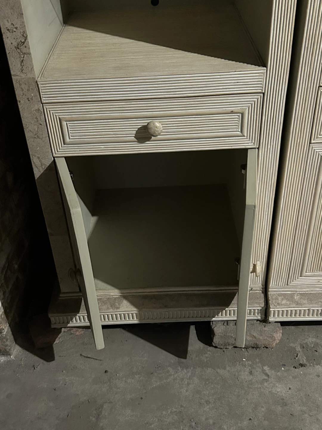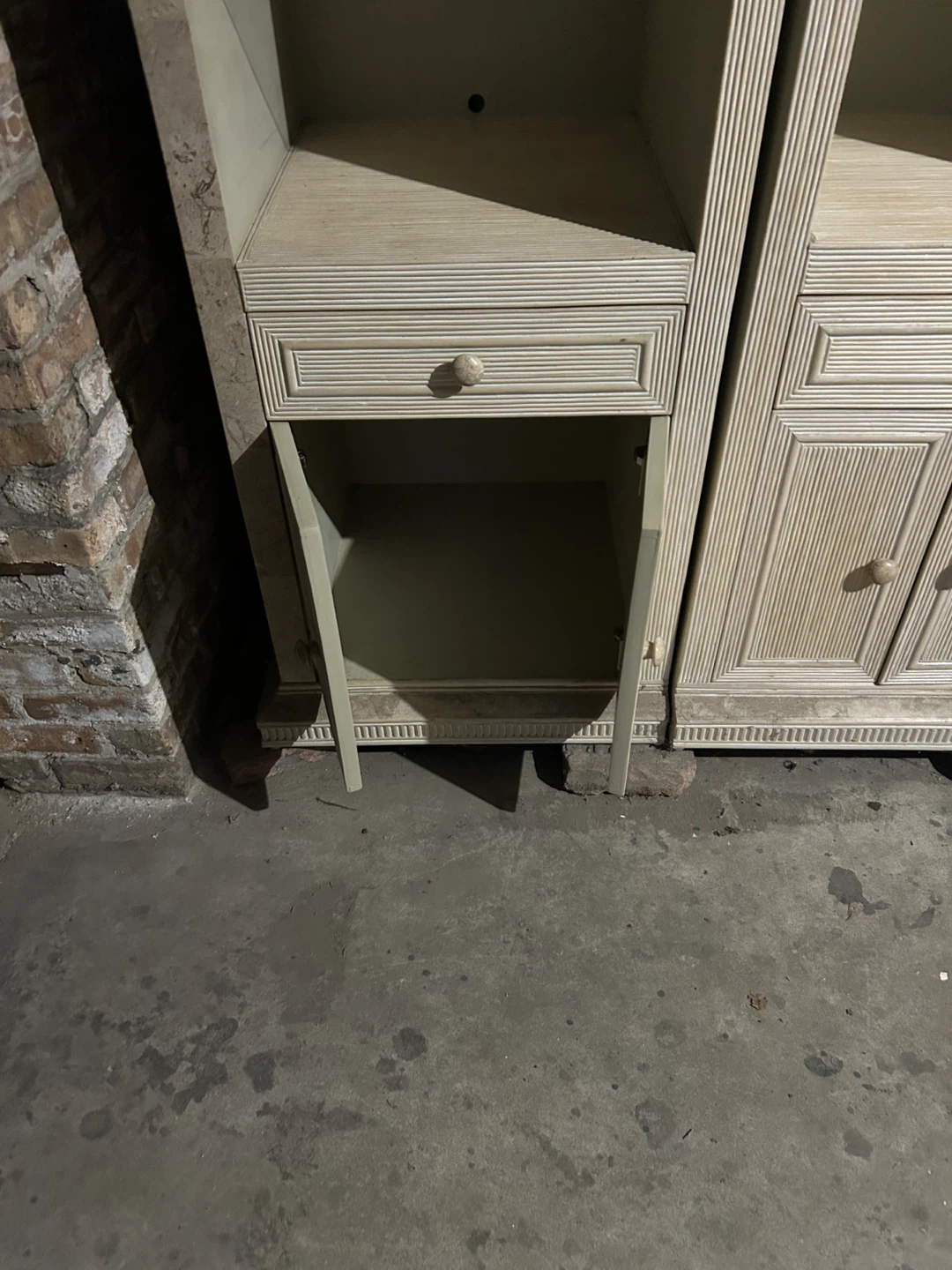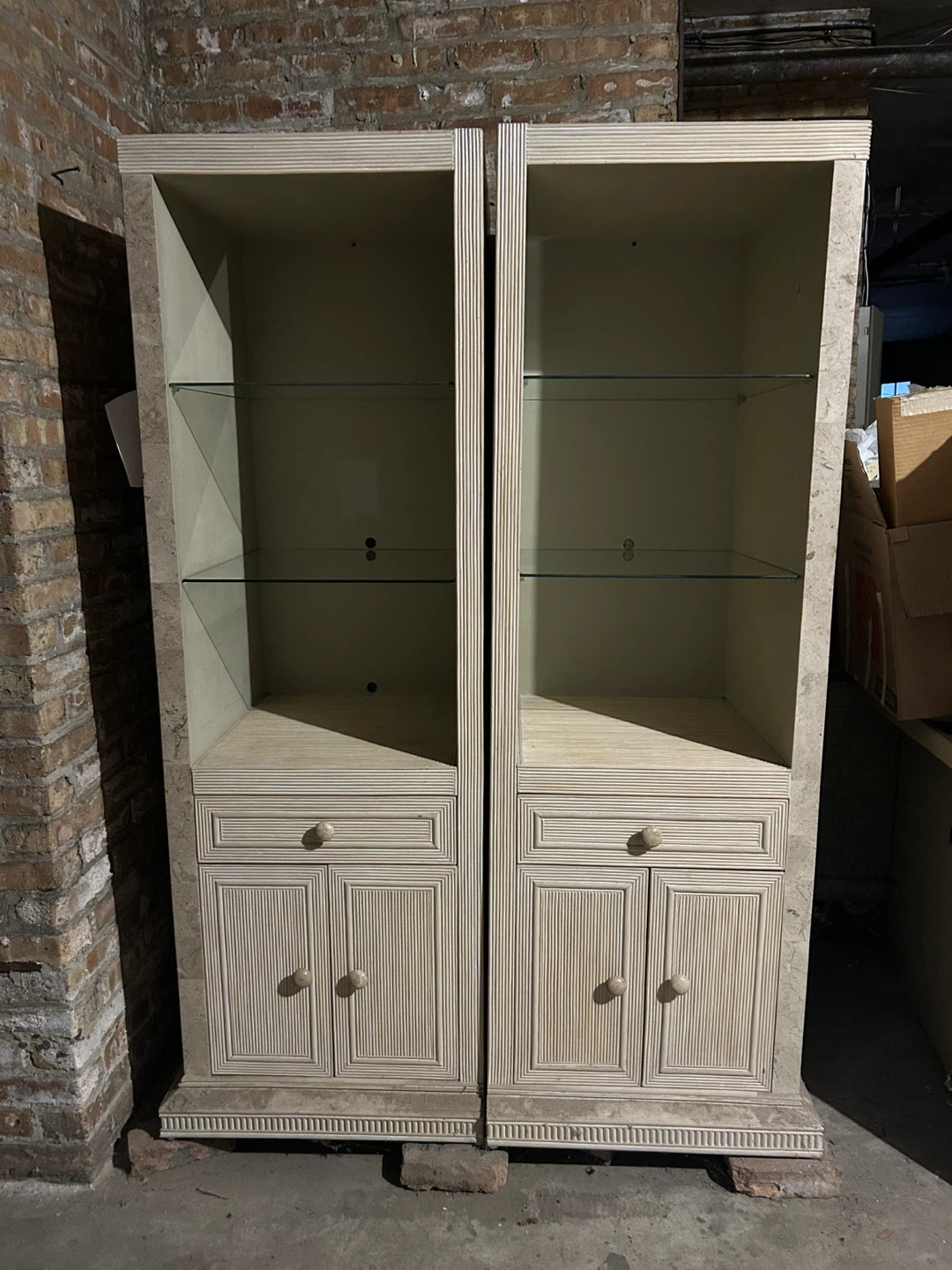 This 2 piece cabinets with glass shelves will make a great addition to any room. They each feature a single drawer and a cabinet below with double doors. They are originally from a high end furniture manufacturer. They feature faux marble accents.