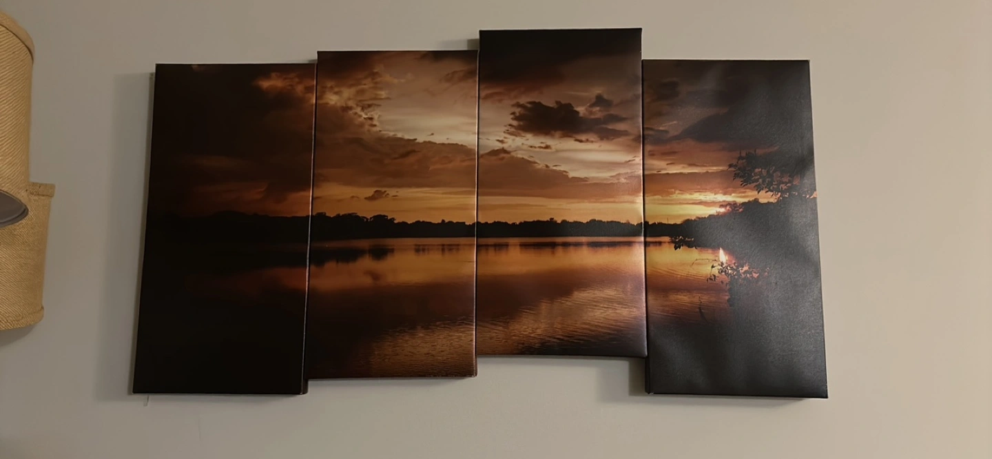 Four-piece canvas wall art set featuring a sunset over a lake. The image is printed on canvas and stretched over a wooden frame. The pieces are designed to be hung together as a single image.