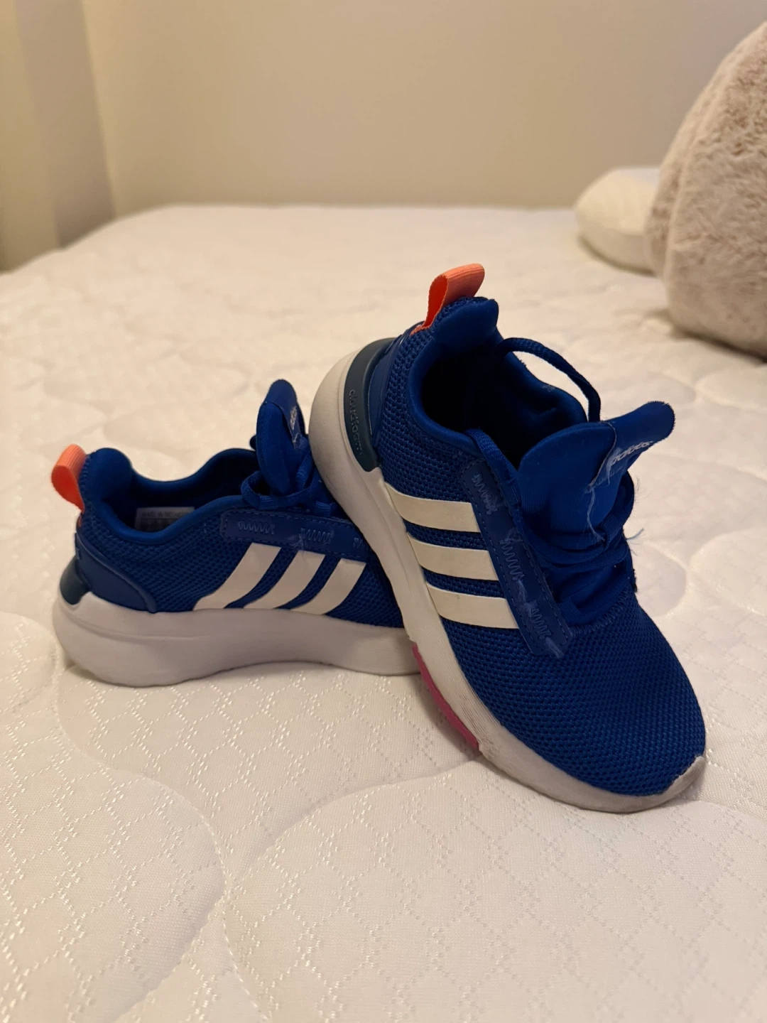 Blue Adidas running shoes for toddlers. Features white Adidas stripes on the sides and orange pull tabs on the heels. Mesh upper for breathability. Great for active little ones!