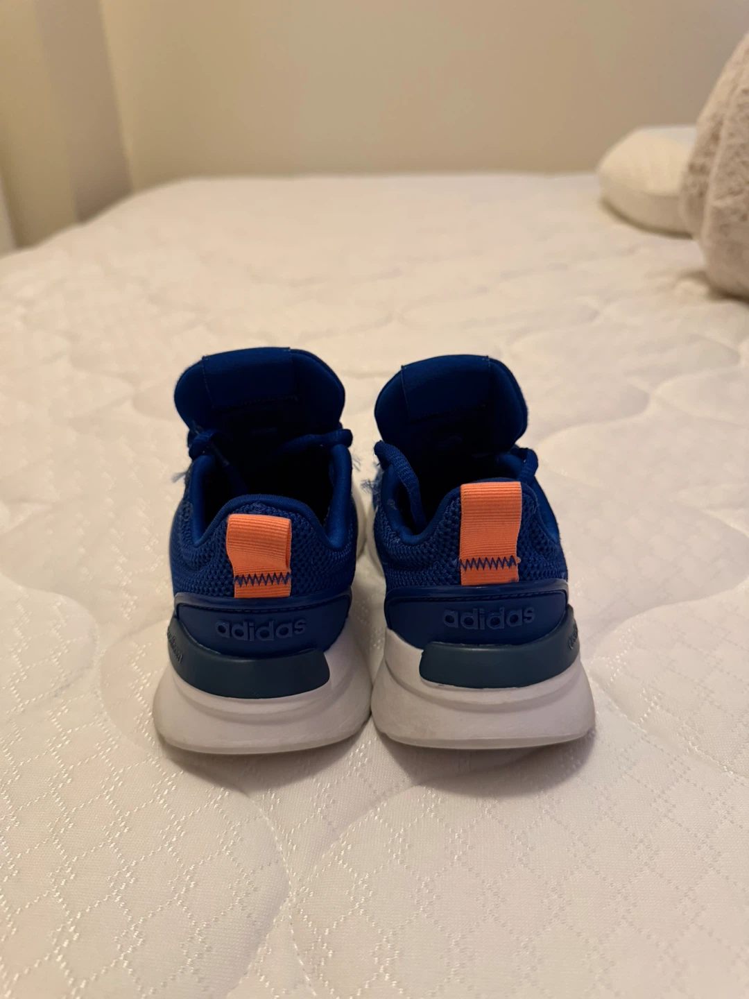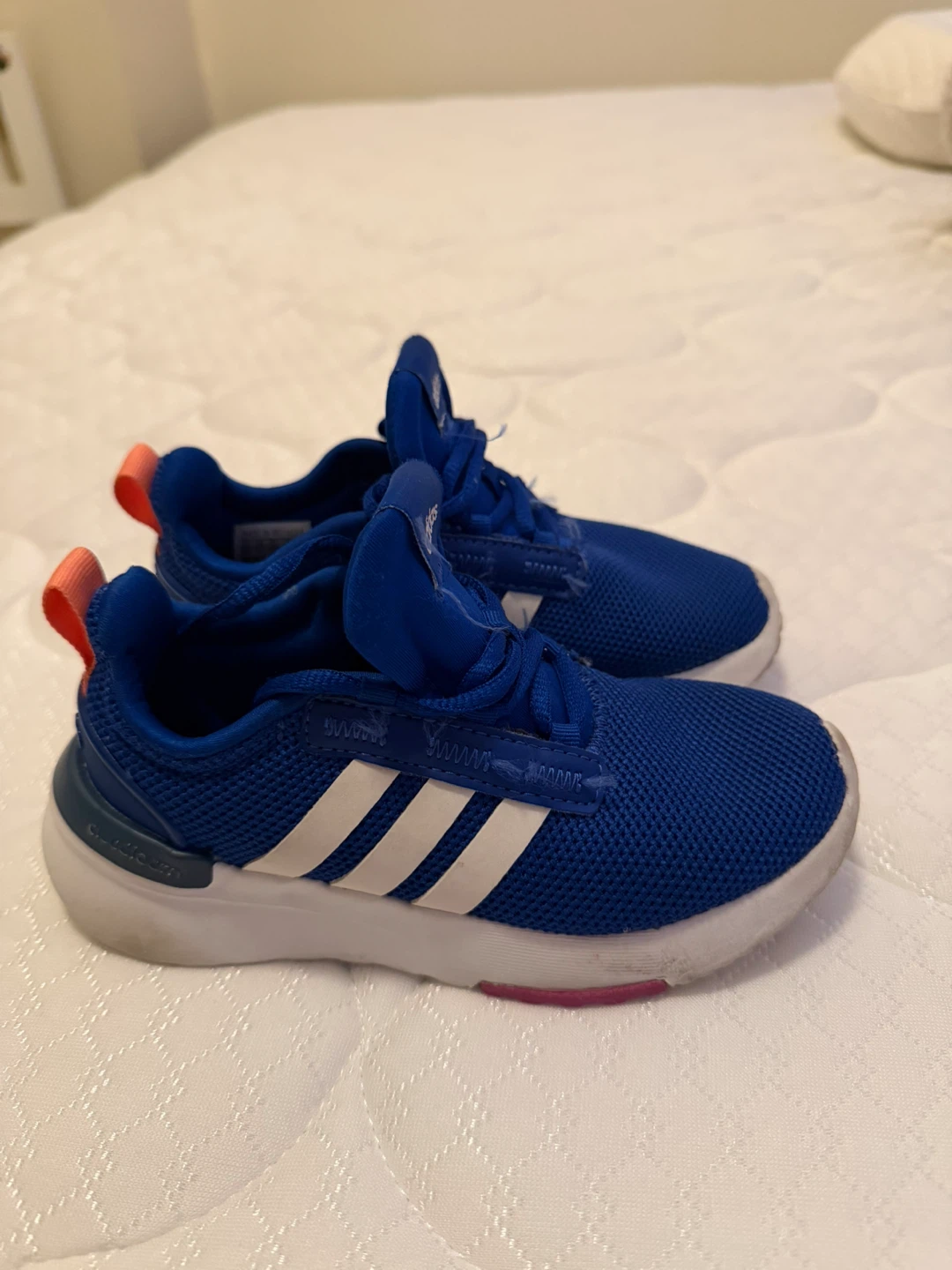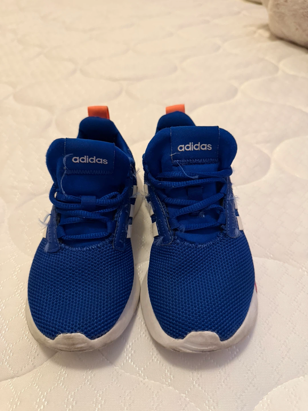 Blue Adidas running shoes for toddlers. Features white Adidas stripes on the sides and orange pull tabs on the heels. Mesh upper for breathability. Great for active little ones!