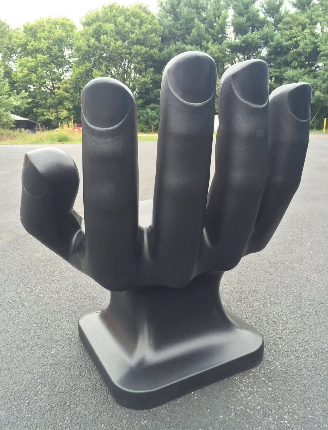 This is a black hand-shaped chair. It's made of a durable material. This chair's unique design makes it a conversation starter!