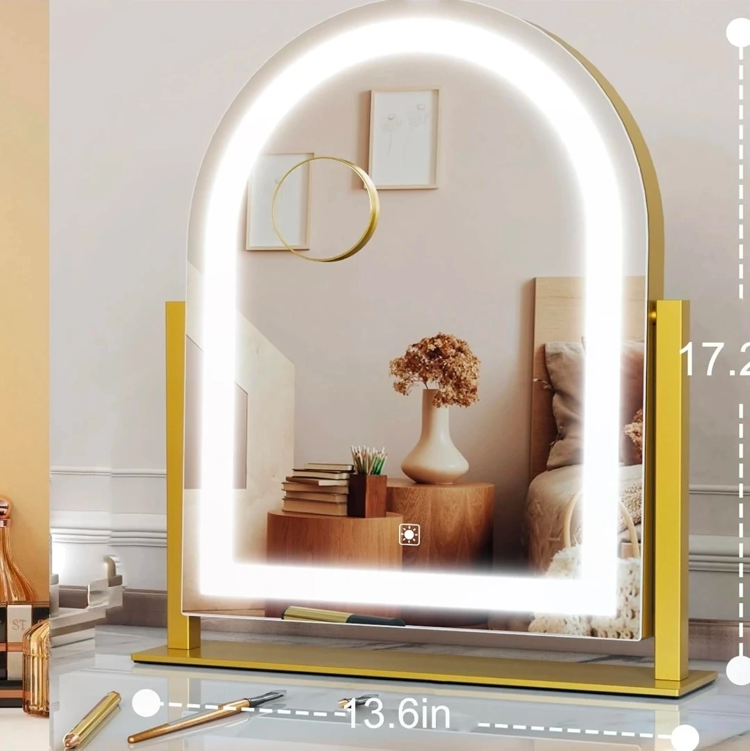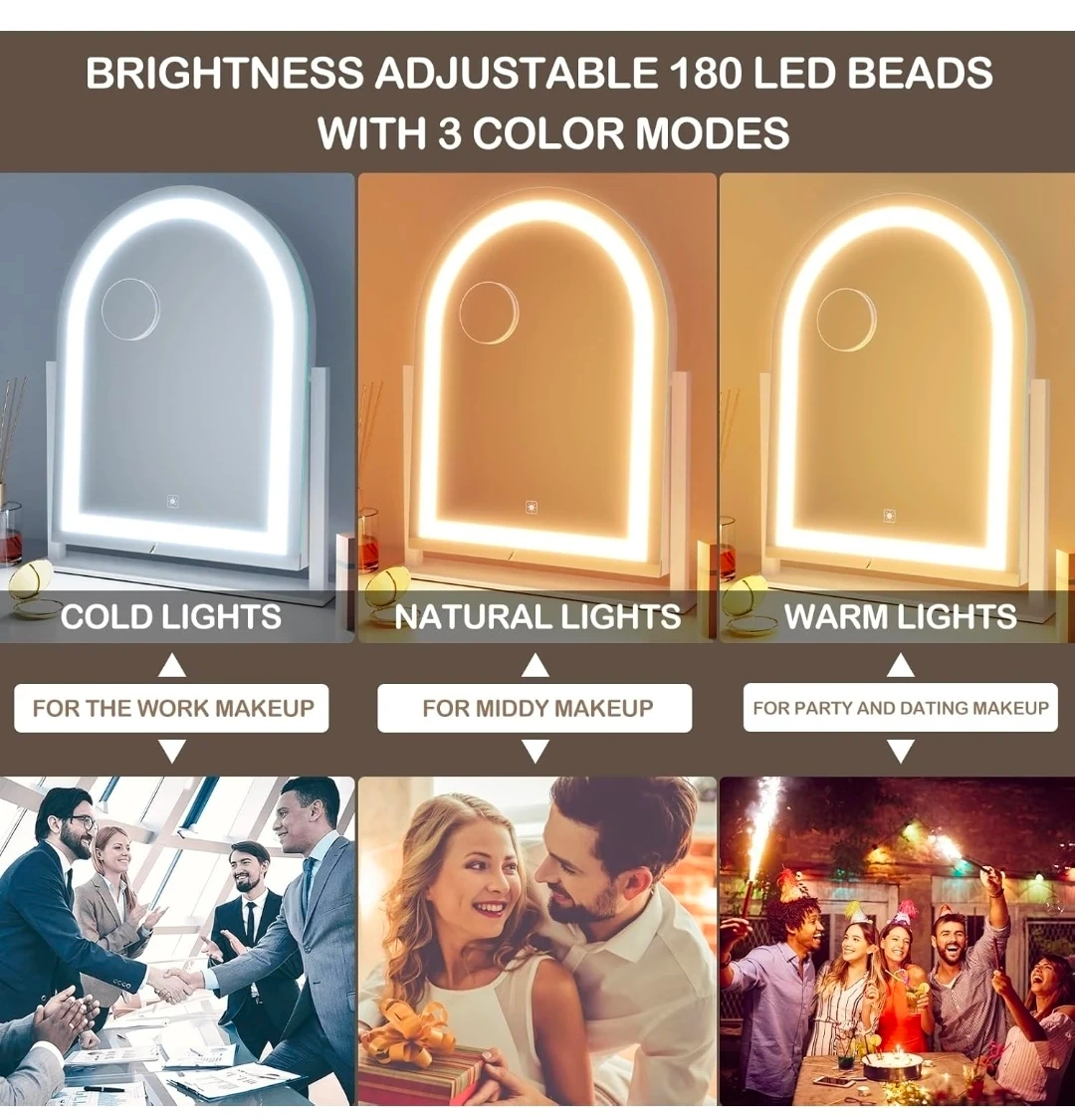 This arched makeup mirror features 180 LED beads with 3 adjustable color modes: cold, natural, and warm lights. Brightness is adjustable by long-pressing the touch control. It's 17.2 inches tall and 13.6 inches wide, with a sturdy white base. Includes USB cables for power.