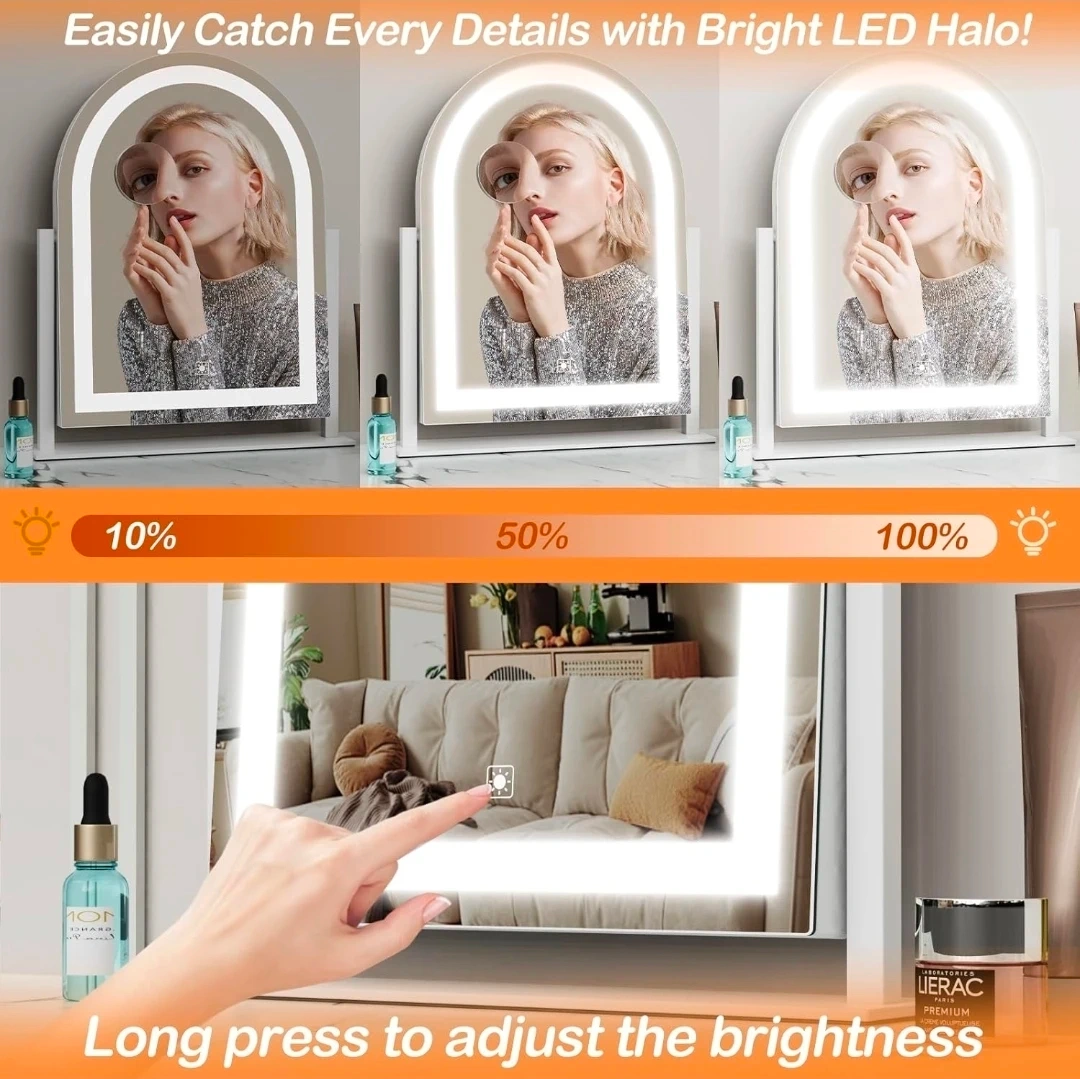 This arched makeup mirror features 180 LED beads with 3 adjustable color modes: cold, natural, and warm lights. Brightness is adjustable by long-pressing the touch control. It's 17.2 inches tall and 13.6 inches wide, with a sturdy white base. Includes USB cables for power.