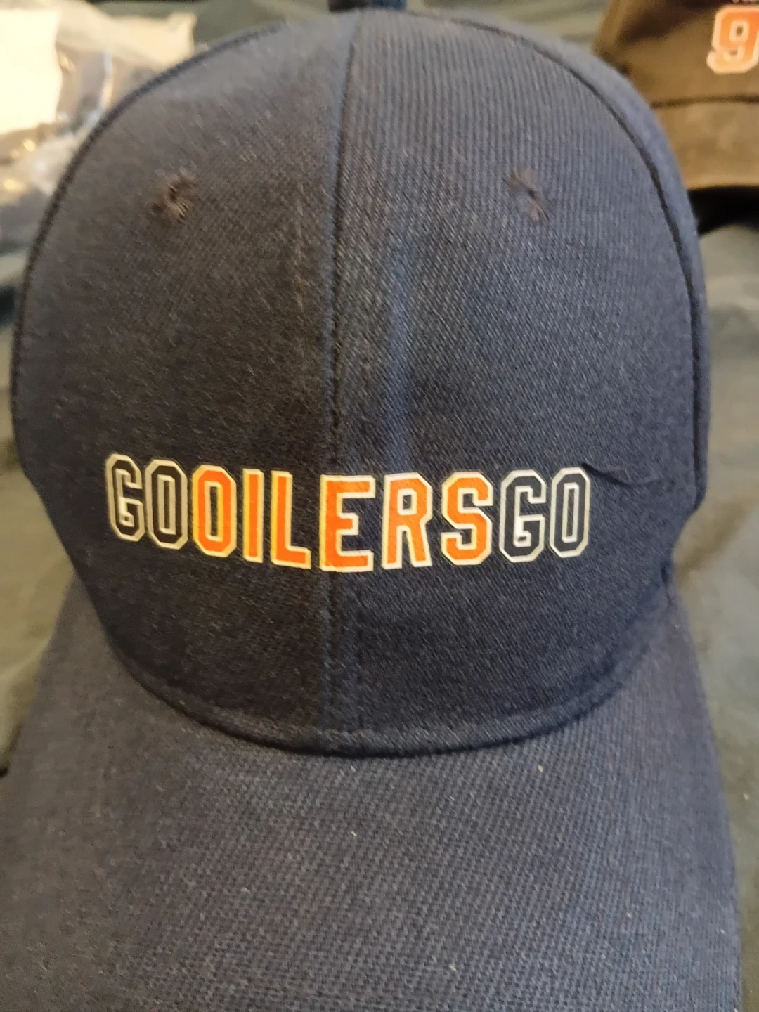 Grey distressed baseball cap with McDavid and 97 printed on the front. Blue baseball cap with 'GOOILERSGO' embroidered on the front.
