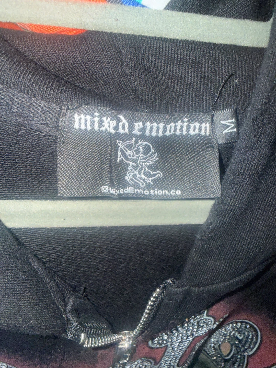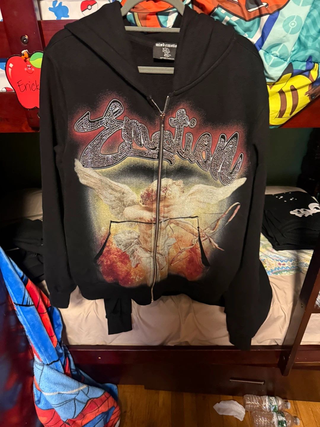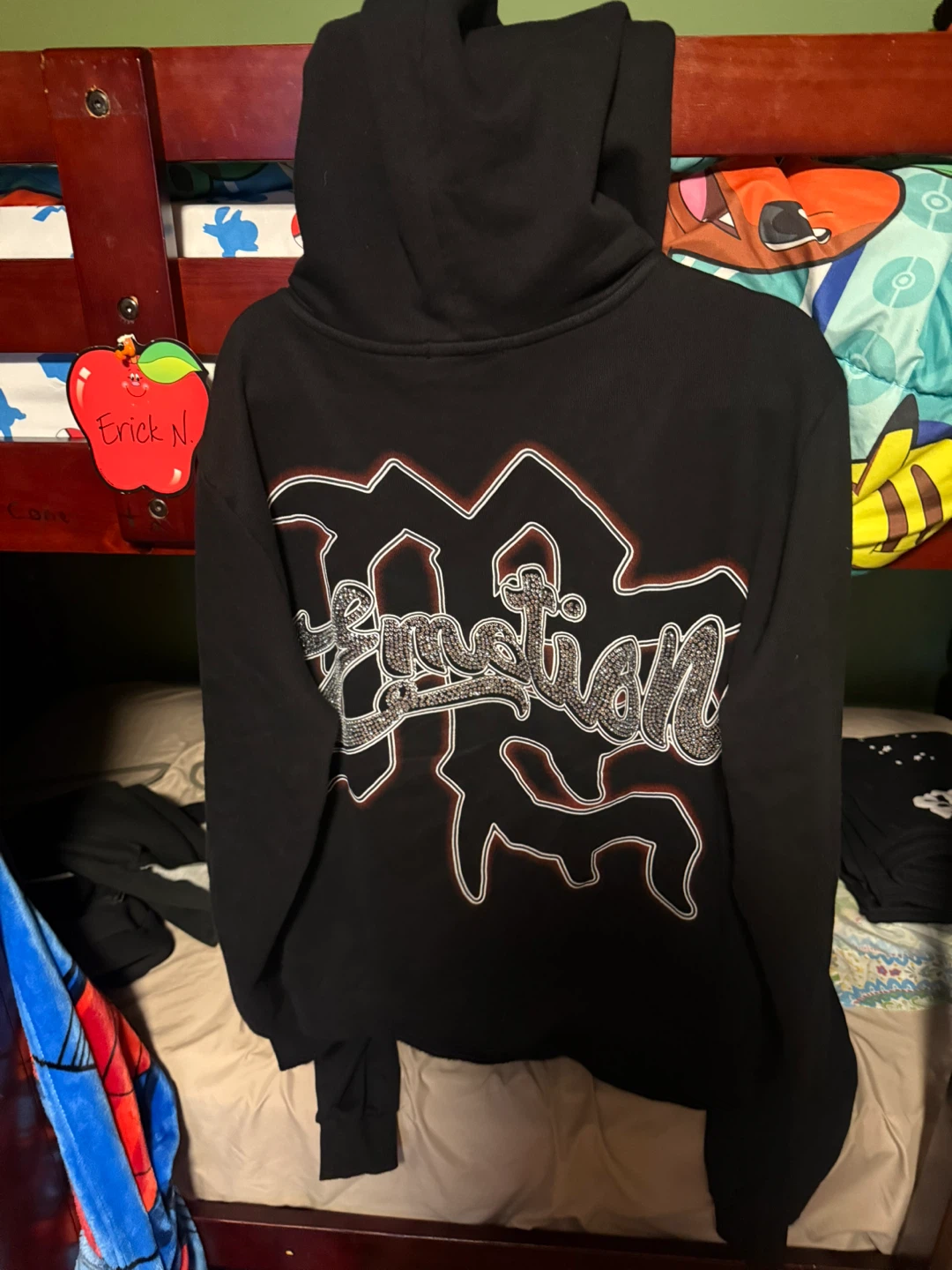 Black zip-up hoodie with "Emotion" graphic on the front and back. Features rhinestone embellishments. Size Medium.
