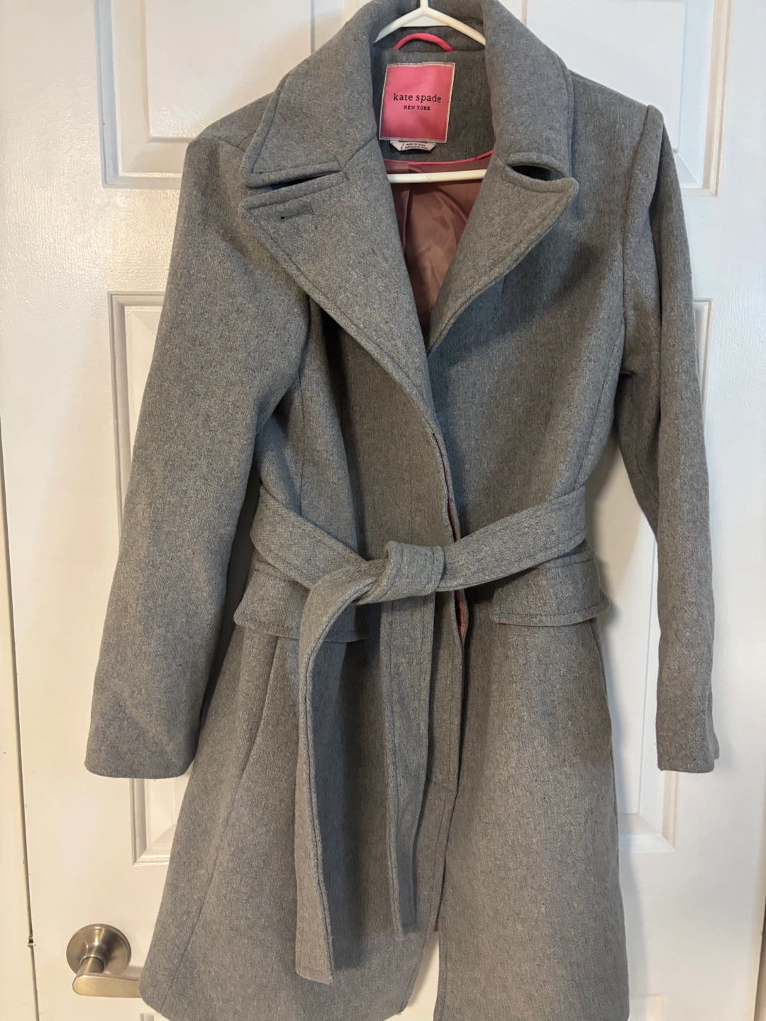 Chic grey wool blend coat from Kate Spade New York. It's a size small with a flattering belted waist. The lining is a pretty pink satin.
