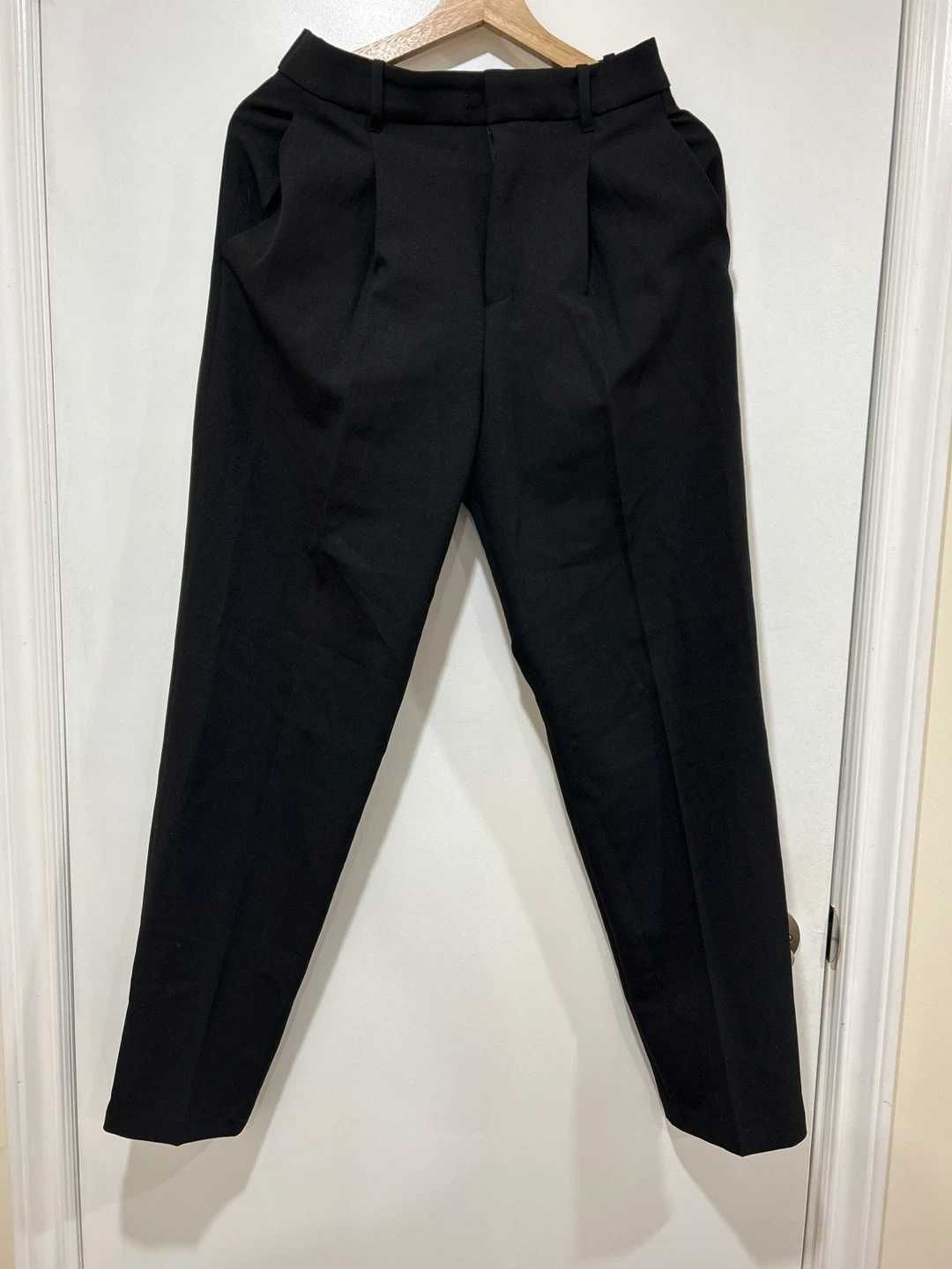 Classic black dress pants with a pleated front. These trousers offer a sophisticated look. Material is a blend, likely polyester and rayon for durability and drape.