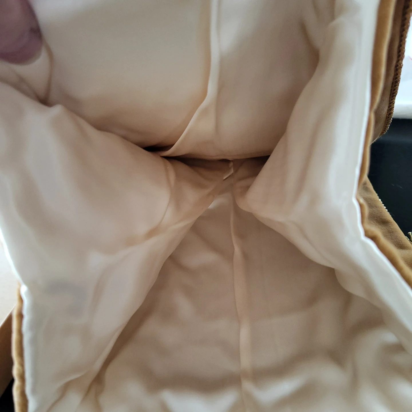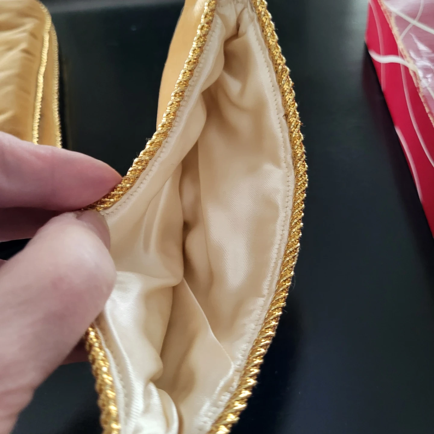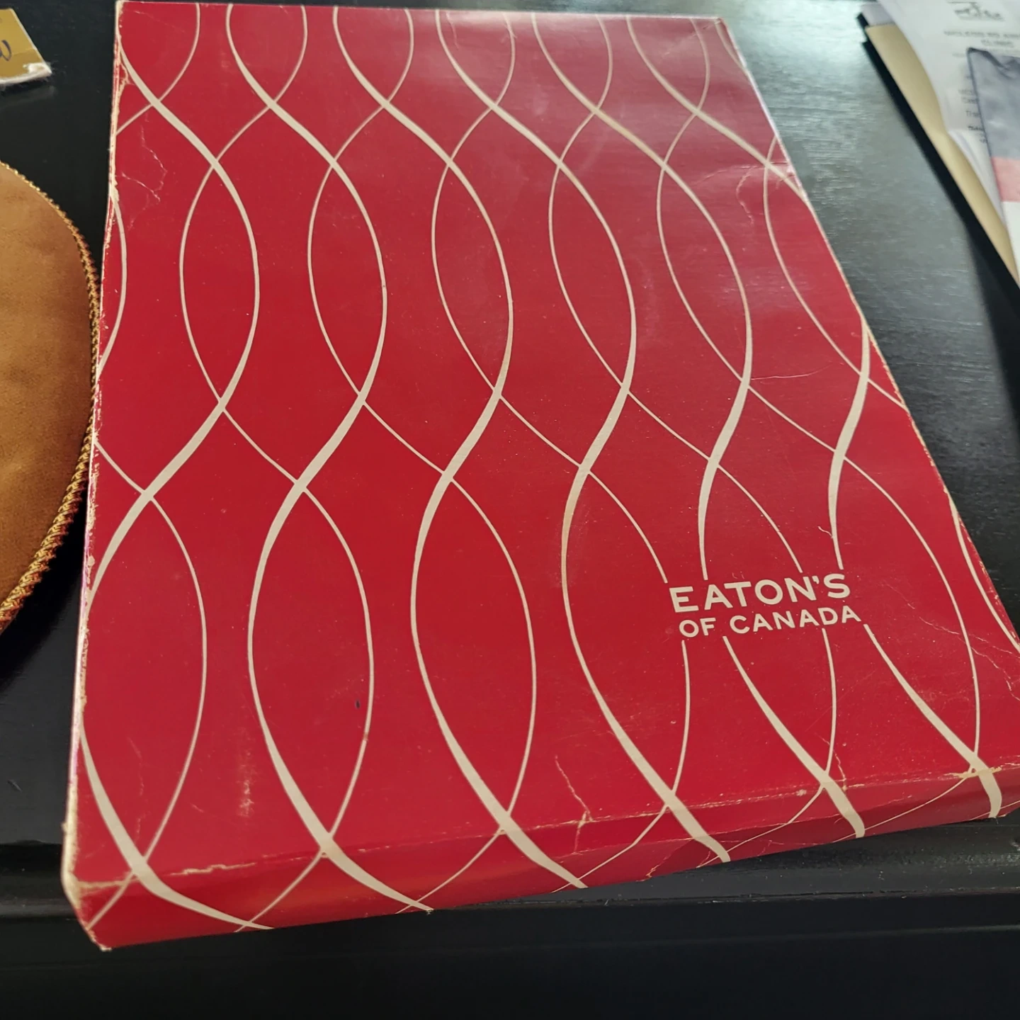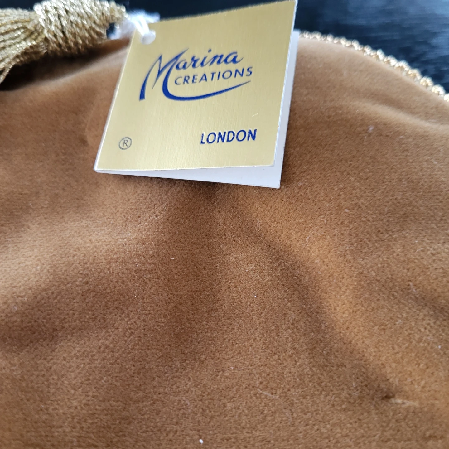Vintage velvet pouches with gold trim by Marina Creations London. Includes original Eaton's of Canada box. The interior is lined with satin material. Box marked as tea cosy.