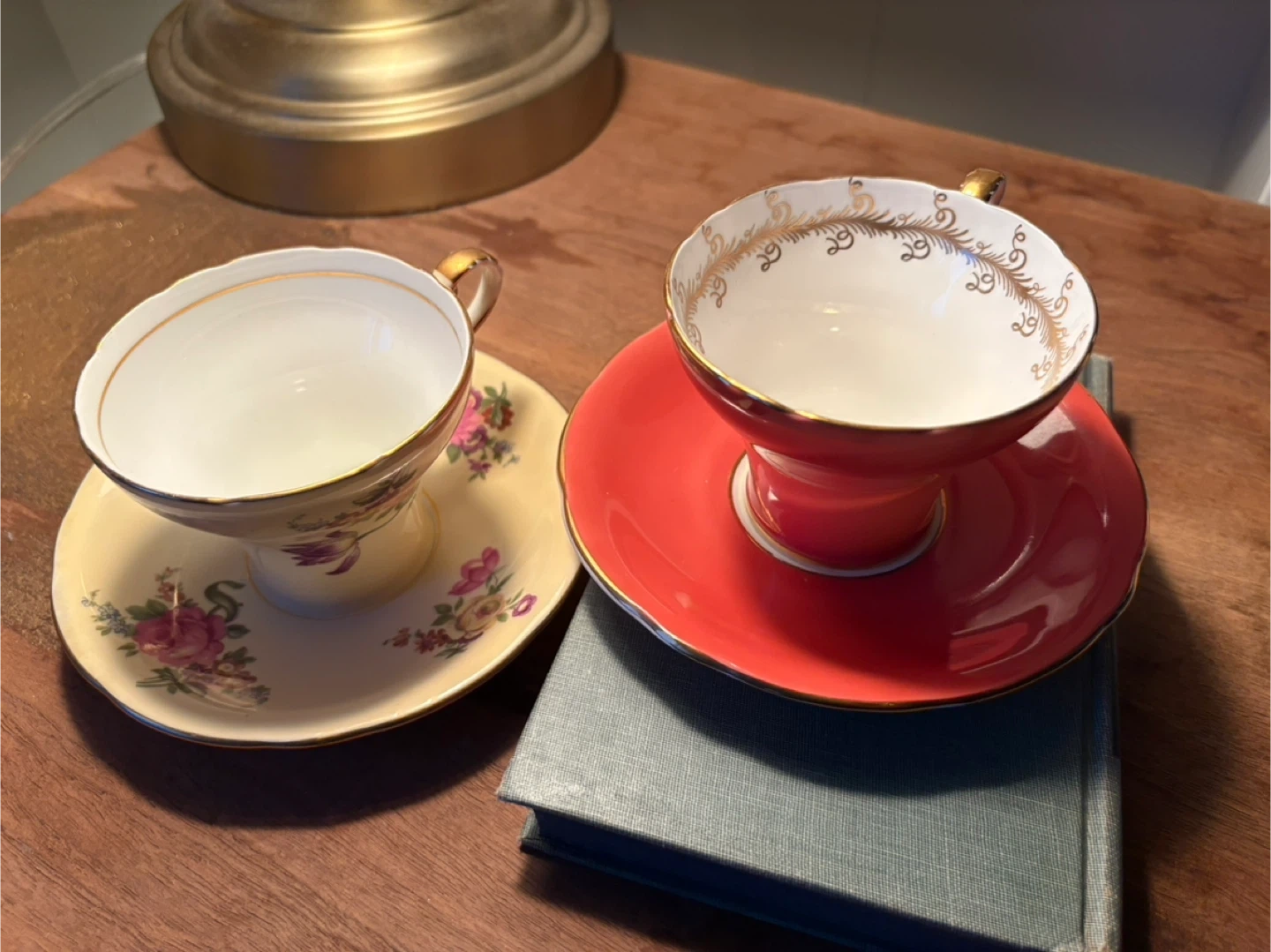 Elegant Aynsley bone china tea cup and saucer set. Features delicate floral patterns on one cup and saucer, and a vibrant red cup and saucer with gold trim. Perfect for a lovely afternoon tea!