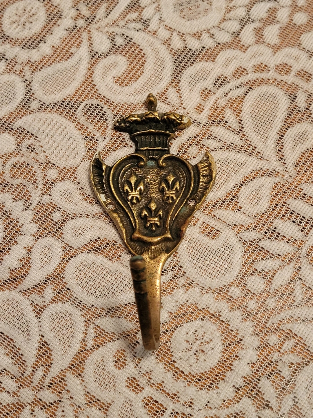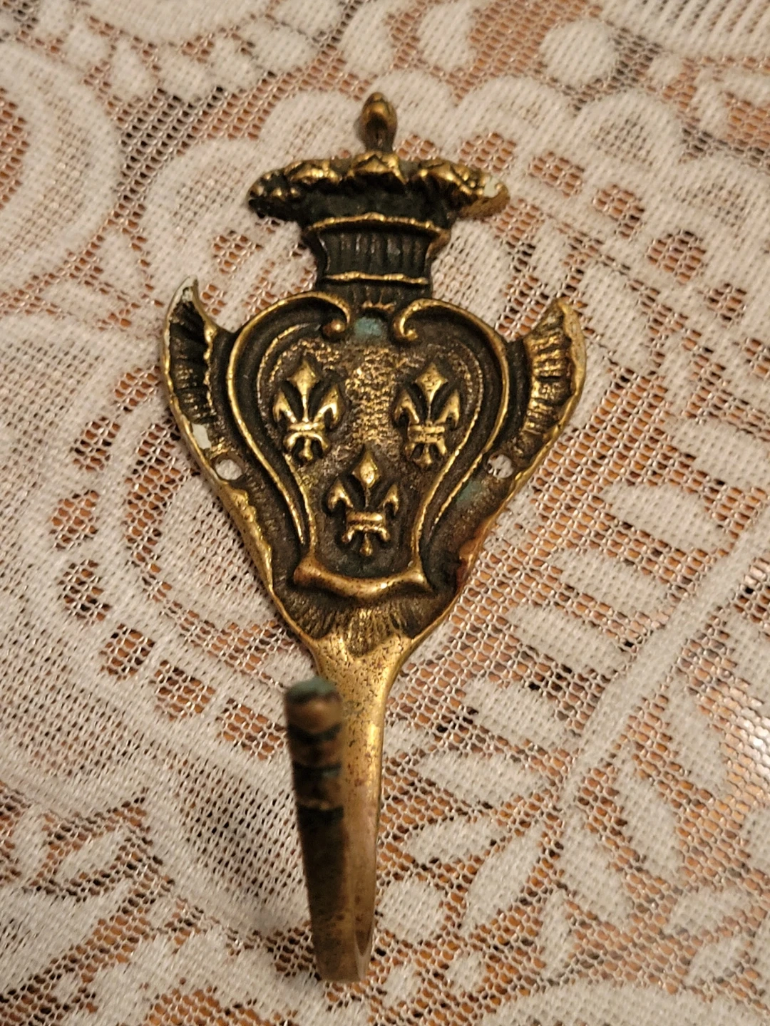 This item is an antique French-style brass wall hook featuring a crown and fleur-de-lis motif.