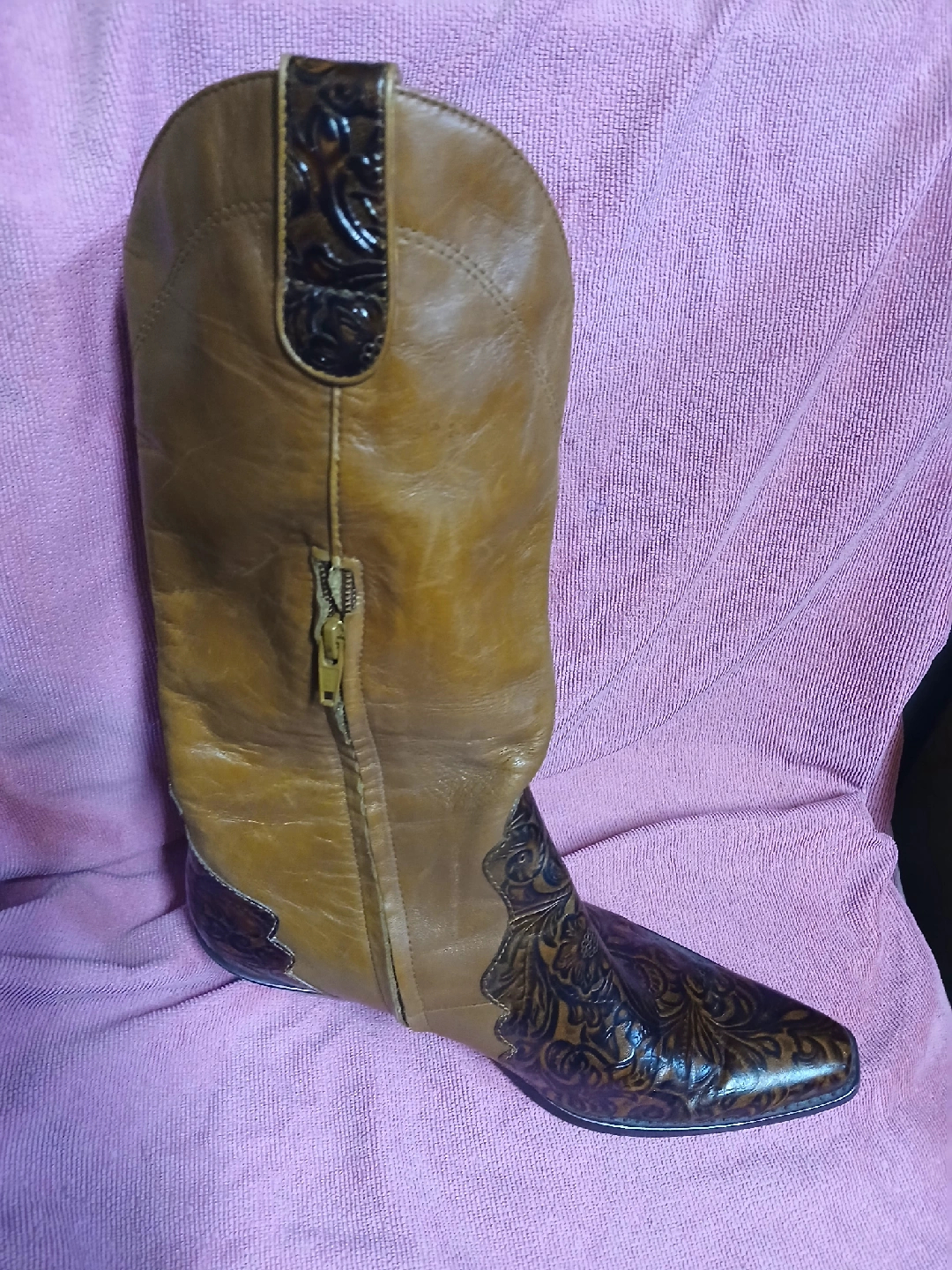 Selling a pair of brown faux leather cowboy boots. They feature a unique floral design on the toe and heel. Perfect for adding a touch of western style to your wardrobe!