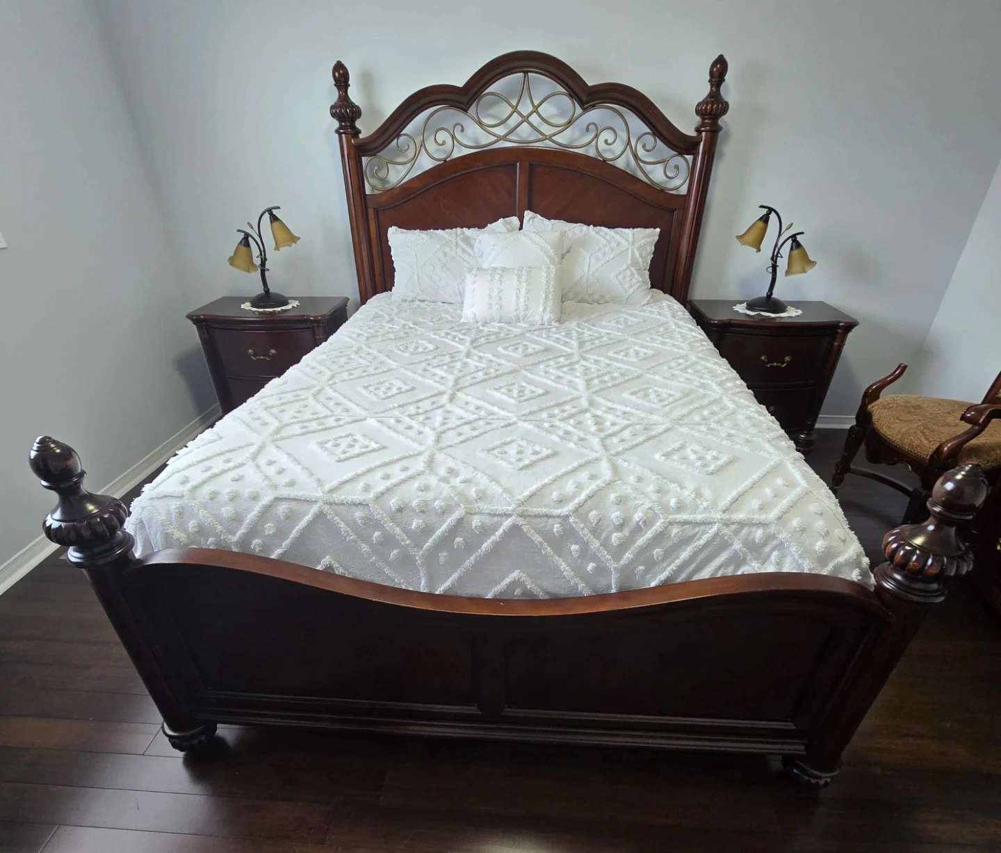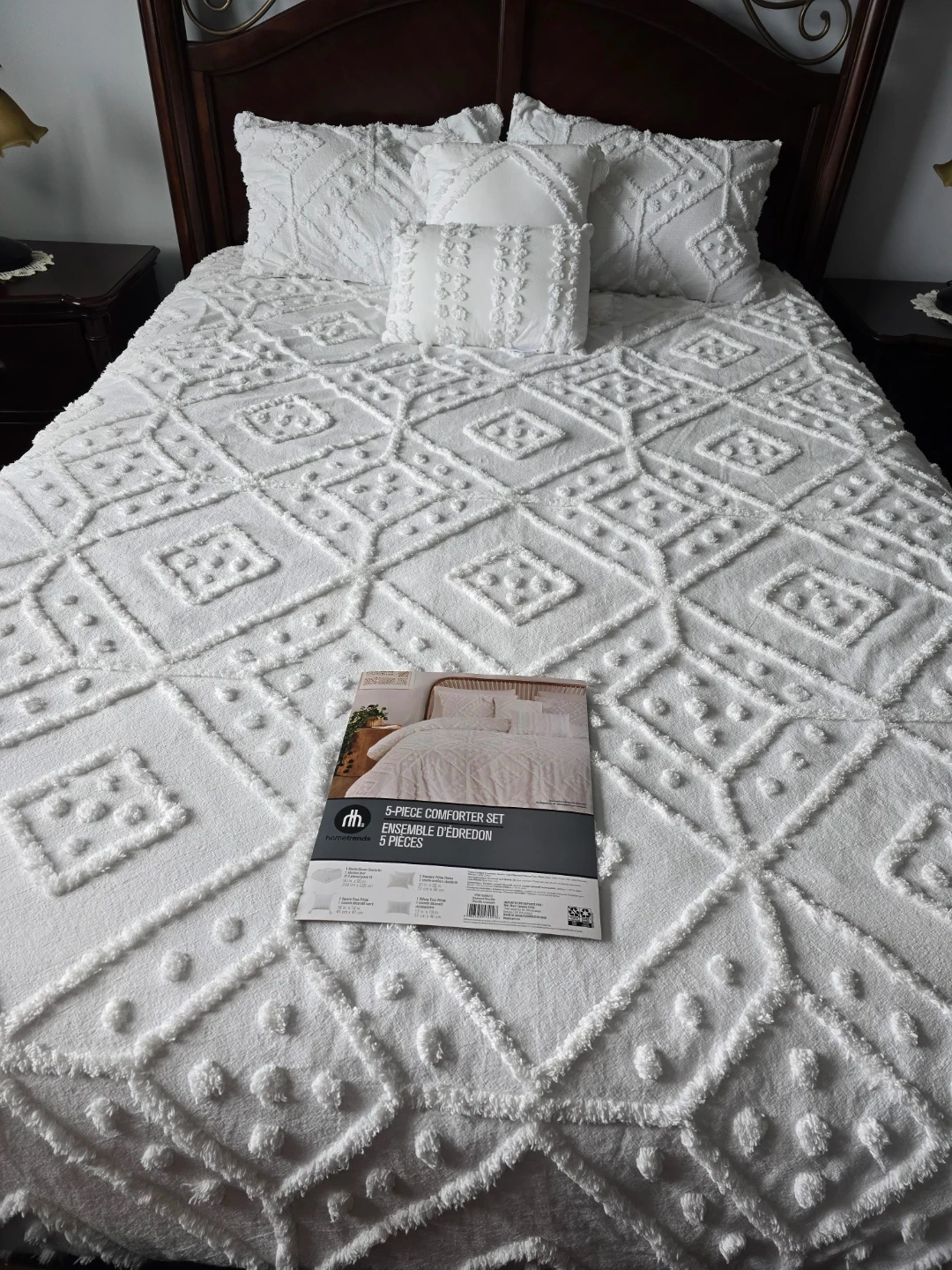 This is a white 5-piece comforter set. It's made of a soft, textured material with a diamond pattern. Includes comforter, shams, and decorative pillows. Perfect for a bedroom refresh!